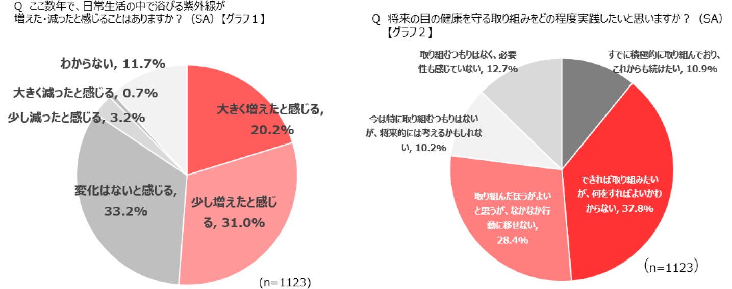 ジョンソン・エンド・ジョンソン*は一般財団法人日本気象協会と共同で、日本全国の10代~50代の1,123名を対象に「紫外線対策や『目の日焼け』に関する意識」に関する独自調査を実施しました。本調査によって、紫外線レベルが近年増加傾向にあるなかで多くの人が「紫外線が強くなっている」という体感がありながらも、『目の日焼け(紫外線による目への影響)』に対する理解が不十分であることがわかりました。