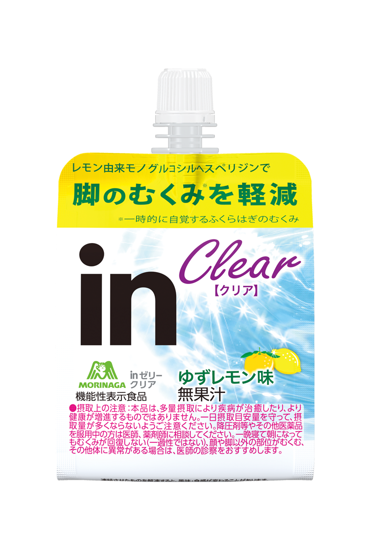 そこで、一時的に自覚する顔のむくみ感や、脚(ふくらはぎ)のむくみを軽減する機能があることが報告されている、レモン由来モノグルコシルヘスペリジンを配合した「inゼリークリア ゆずレモン味」を開発しました。