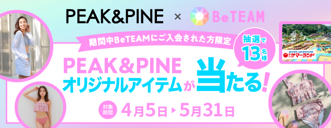 女性の美しさを引き出すデザインとシルエットを兼ね備えた水着を提供する「PEAK&PINE」と、女性の身体と心に合わせたダイエットメソッドを取り入れた「BeTEAM」。本コラボレーションを通して、夏に向けてダイエットにチャレンジする女性を応援いたします。