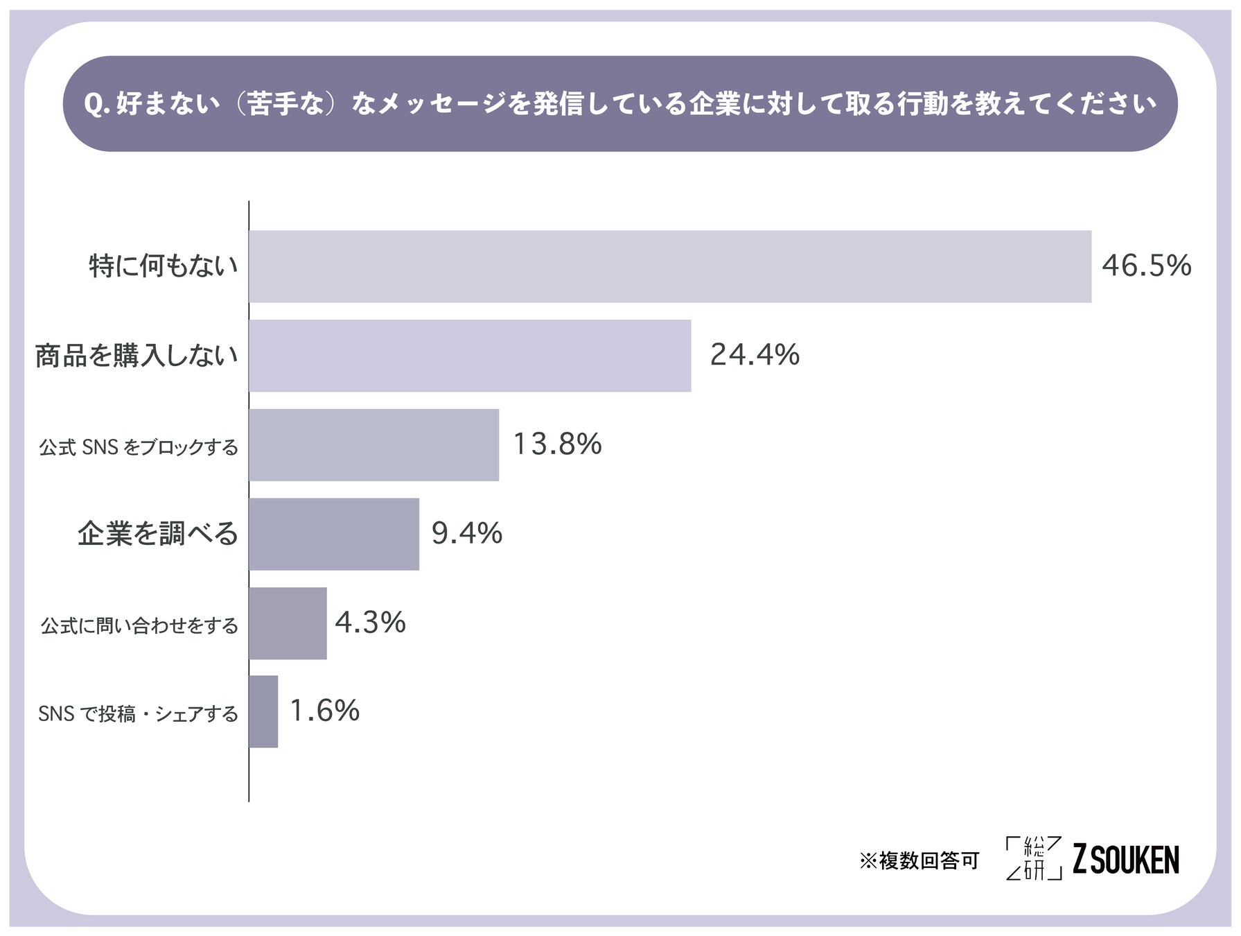 アンケートにて、「好まない(苦手な)メッセージを発信している企業に対して取る行動を教えてください」と尋ねたところ、「特に何もしない(46.5%)」が最も多く、続いて「商品を購入しない(24.4%)」、「公式SNSをブロックする(13.8%)」という結果になりました。好まない(苦手な)メッセージを発信している企業に対しては、そもそも関心を持たずに何も行動を起こさないZ世代が大半で、行動を起こしたとしても「商品を購入しない」や「公式SNSをブロックする」などネガティブな行動が多いことがわかりました。