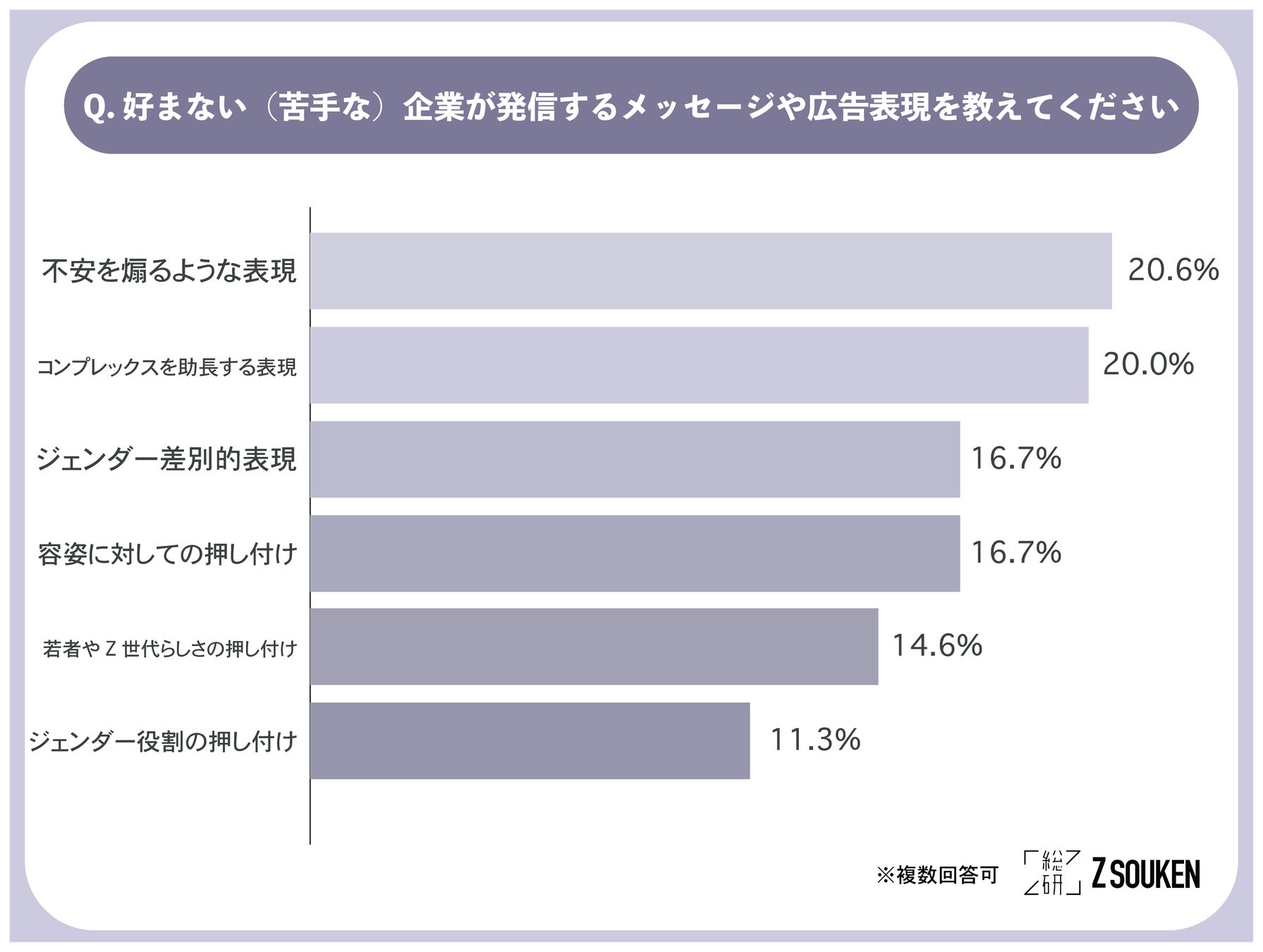 アンケートにて「好まない(苦手な)企業が発信するメッセージや広告表現を教えてください」と尋ねたところ、最も回答が多かったのが「不安を煽るような表現(20.6%)」で、続いて「コンプレックスを助長する表現(20.0%)」、同率で「ジェンダー差別的表現(16.7%)」、「容姿に対しての押し付け(16.7%)」となりました。
