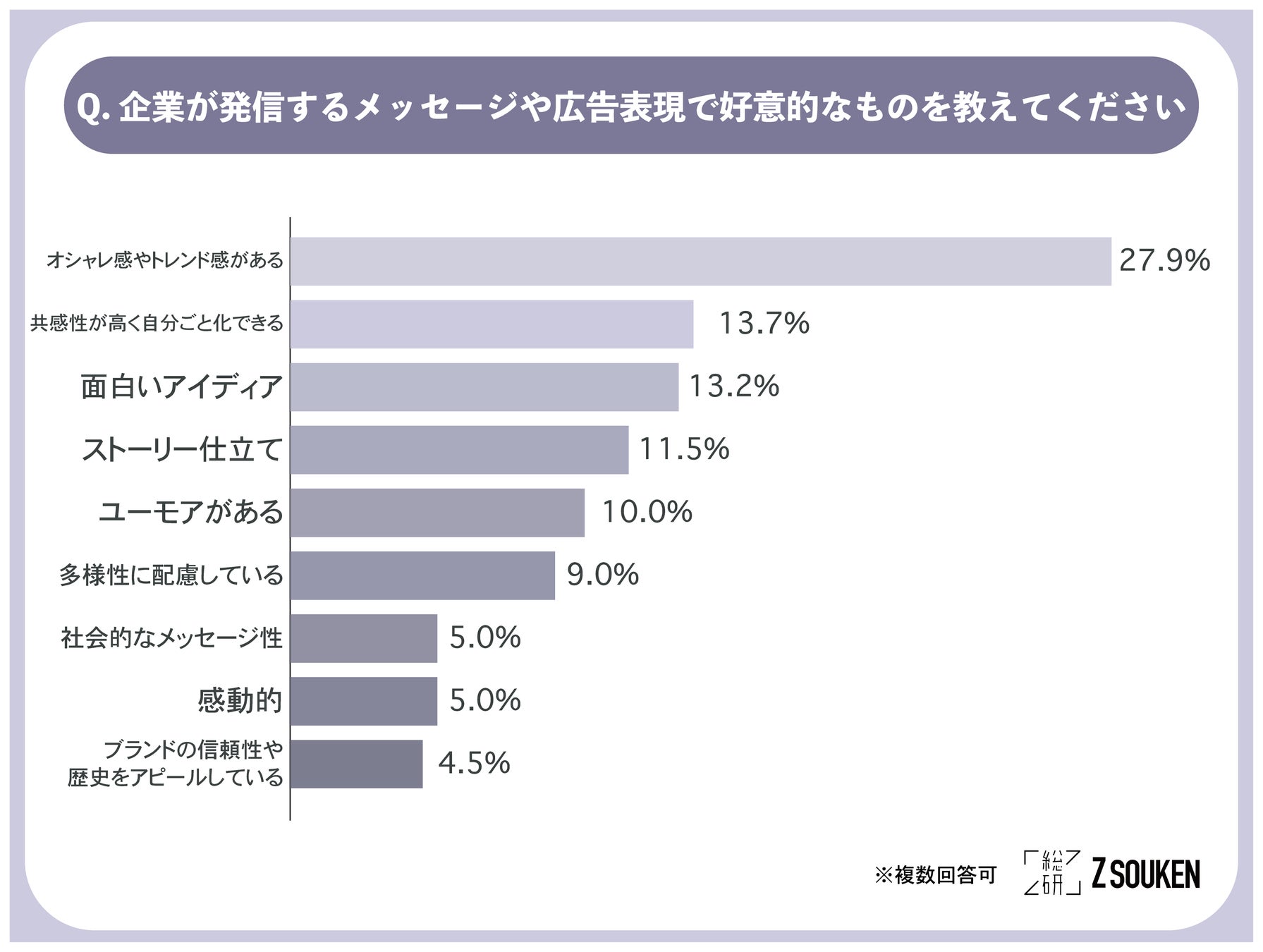 アンケートにて「企業が発信するメッセージや広告表現で好意的なものを教えてください」と尋ねたところ、「オシャレ感やトレンド感がある(27.9%)」が1位、「共感性が高く自分ごと化できる(13.7%)」が2位となりました。その他には「面白いアイディア(13.2%)」、「ストーリー仕立て(11.5%)」、「ユーモアがある(10.0%)」がランクインしており、広告でもエンタメ要素の強いものが好意的に捉えられやすいのかもしれません。