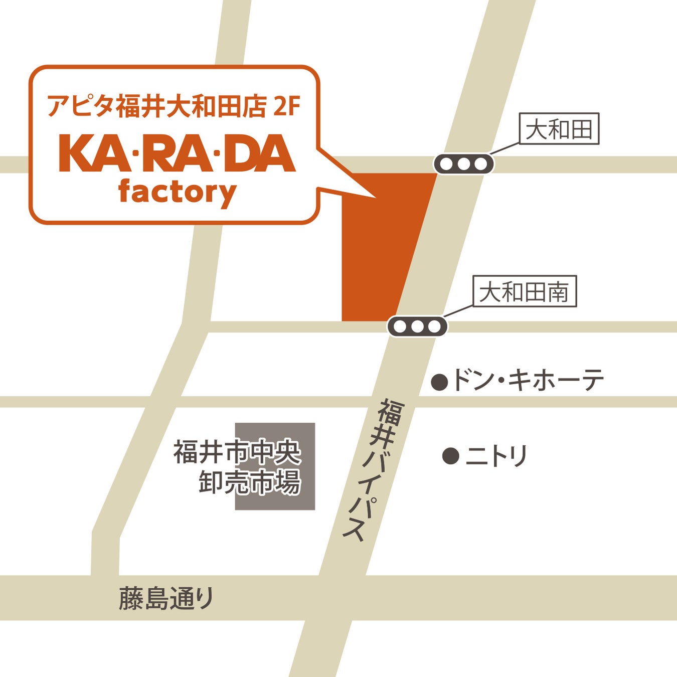 アピタ福井大和田店は、ファッション、グルメ、雑貨など多彩な専門店が集まる福井県下一のショッピングモールとして知られており、カラダファクトリーは2階フロアにオープンいたします。お仕事帰りやお買い物の際に、ぜひお気軽にお立ち寄りください。
