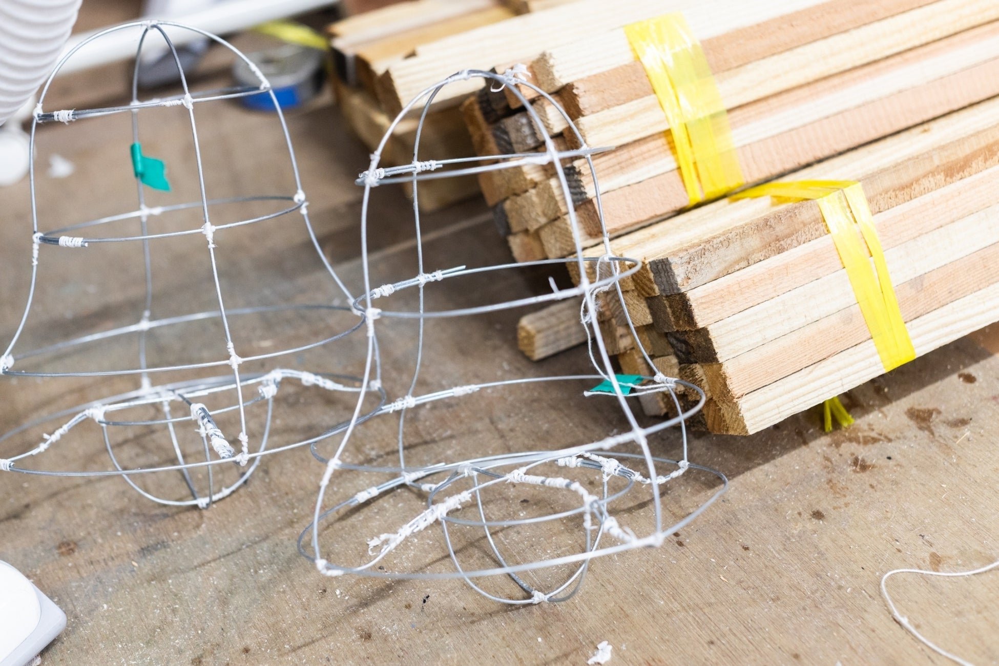 角材で支柱を作り、針金や糸を組み合わせて、紙をはれるように形を整えていきます。昔は針金ではなく、骨組みは竹で作られていたそうです。