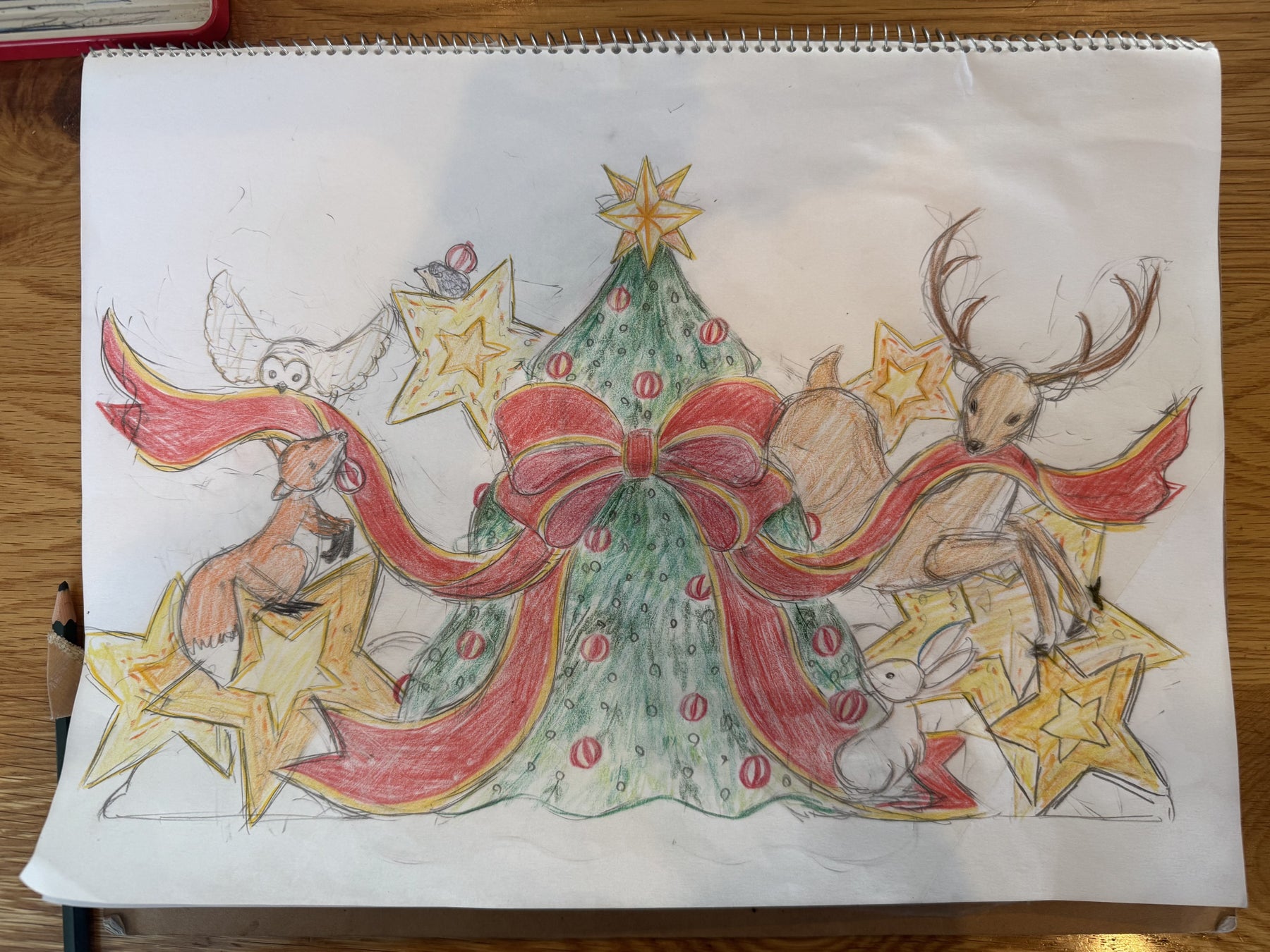 ねぶたの設計図となる重要なプロセスなため、ねぶた師が長い時間をかけて準備する制作の第一歩。クリスマスのよろこびや楽しさなどのコンセプトを元に構想を練り、鉛筆で下書きしたあとに色を付けていきます。