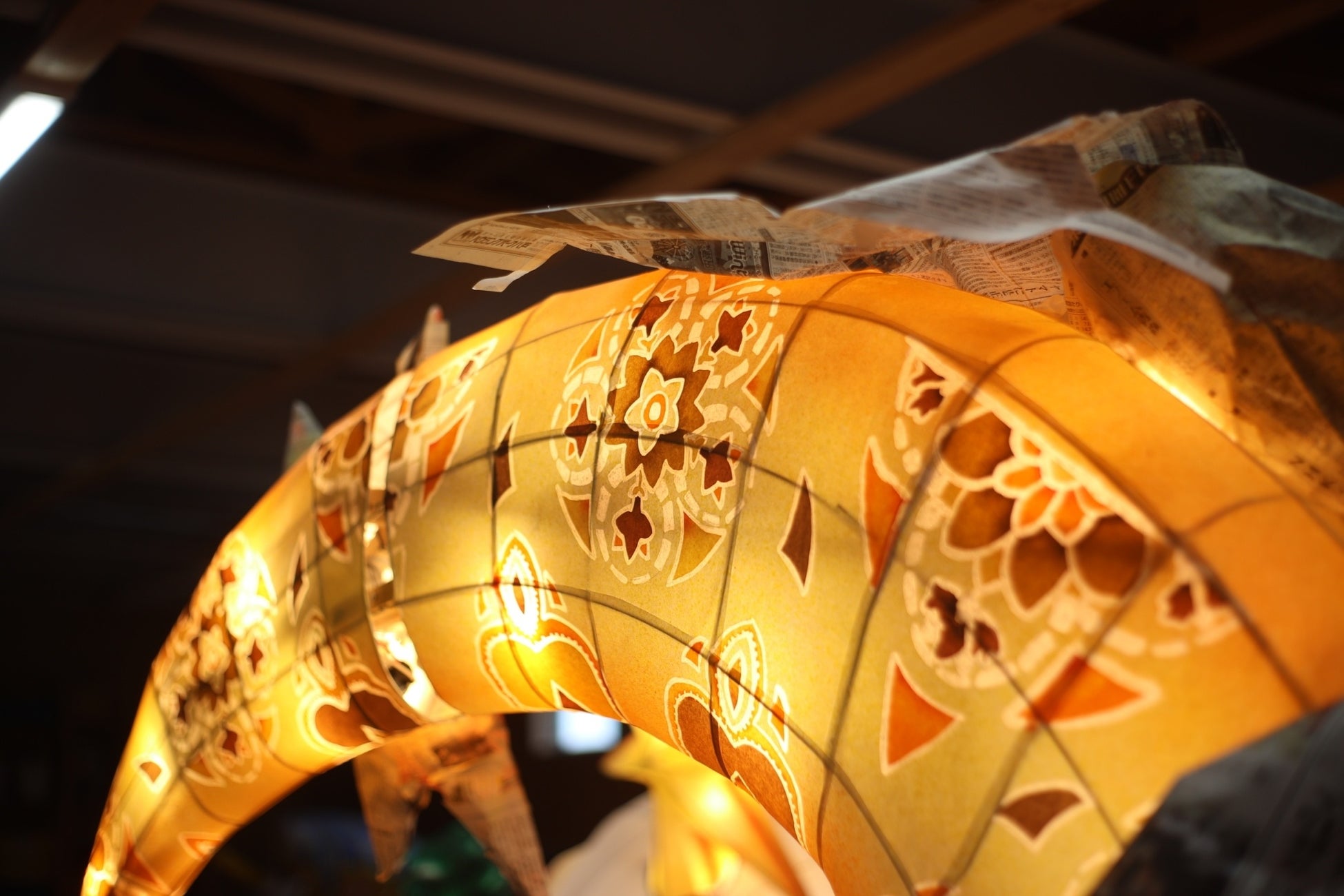 専門の配線工によって、ねぶたの内側に通常1,000個近くの照明器具が取り付けられていきます。今回のシャングリ・ラ 東京のねぶたには約200個の電球が取り付けられています。