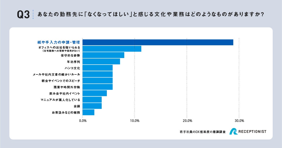 しかしながら、なくなって欲しい文化や業務について尋ねると「紙や手入力の申請・管理」などが上がり、アナログな文化に不満を持っていることがわかります。(Q3)