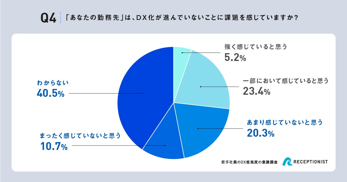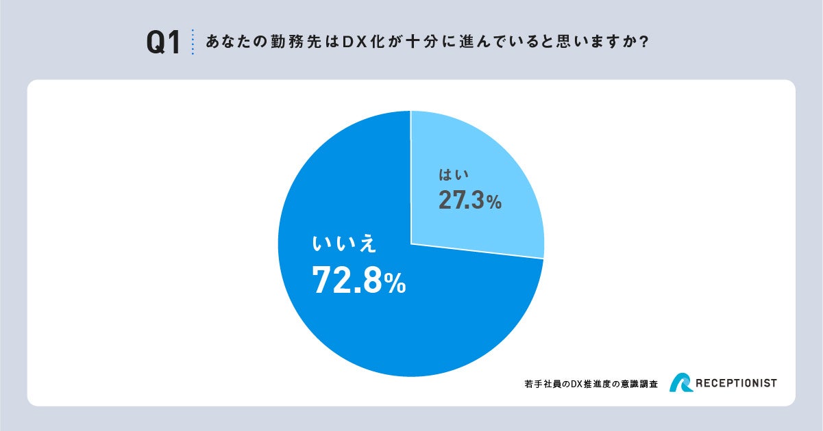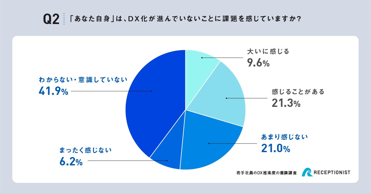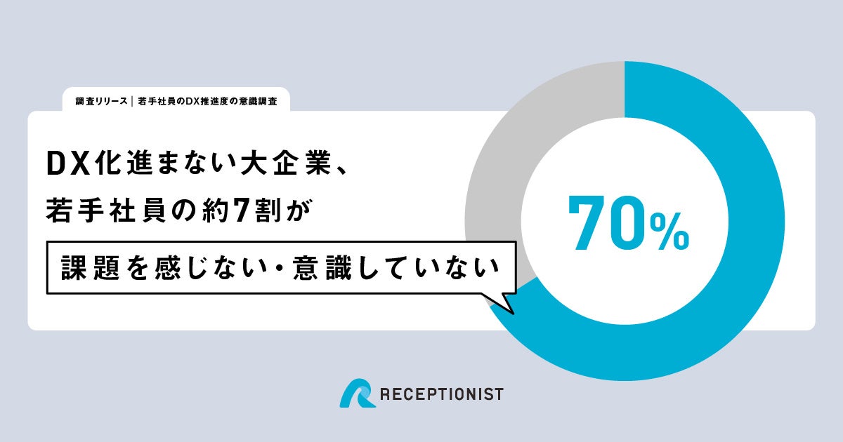 クラウド受付システム「RECEPTIONITST」を開発・運営する株式会社RECEPTIONIST(本社:東京都渋谷区、代表取締役:橋本真里子)は、1,000名以上規模の大企業に勤める30代までの一般社員を対象とした「DX化に関する意識調査(以下、本調査)」を実施しました。その結果、若手社員の7割が「DX化について課題を感じない・意識していない」と回答し、消極的な意見を持っていることがわかりました。