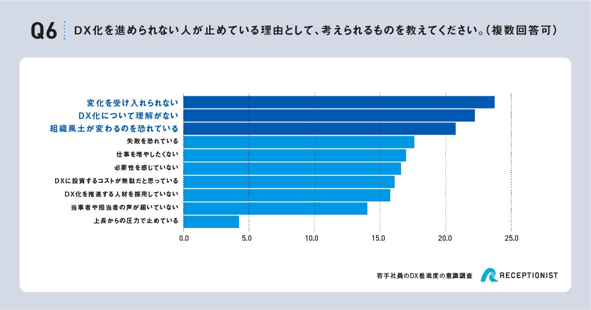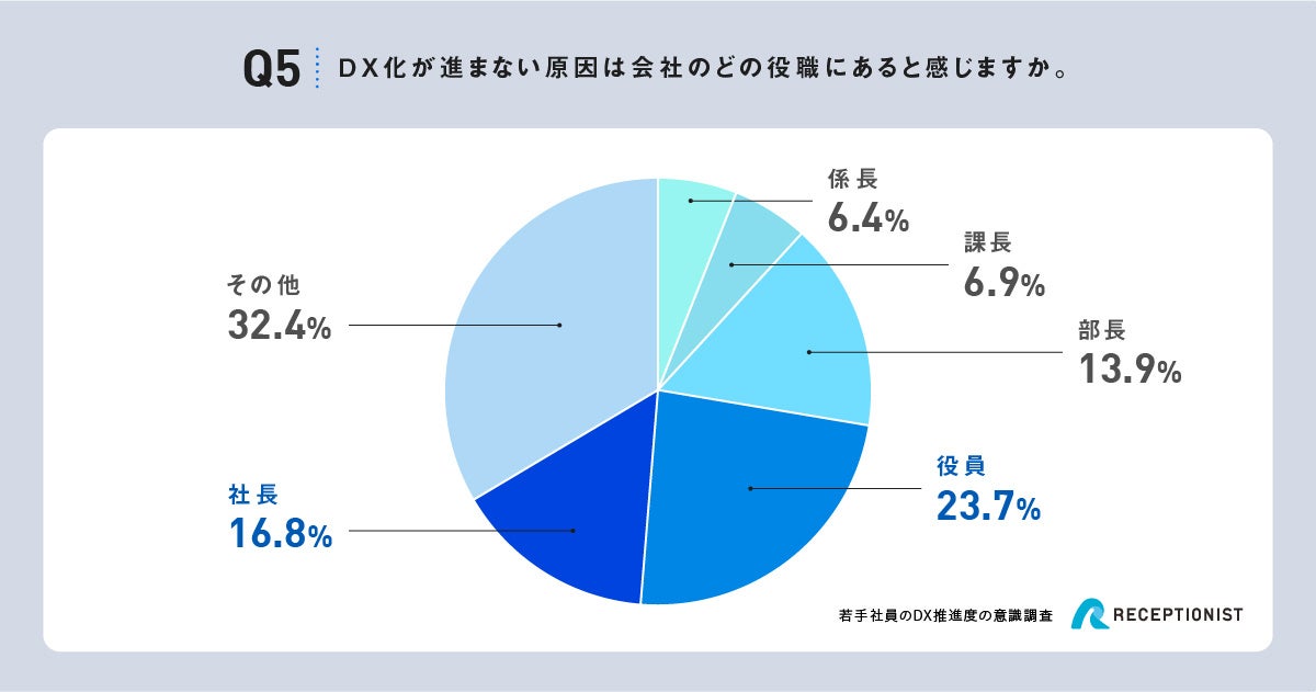 さらに、「DX化が進まない原因は会社のどの役職にあると感じますか?」の問いには「役員」「社長」の合計が4割を占め、具体的な理由として「変化を受け入れられない」「DXに対して理解がない」「組織風土が変わるのを恐れている」等があがり、経営層のDXに対する姿勢がネガティブであることがDX化を妨げていると感じていることが顕著に現れました。(Q5)