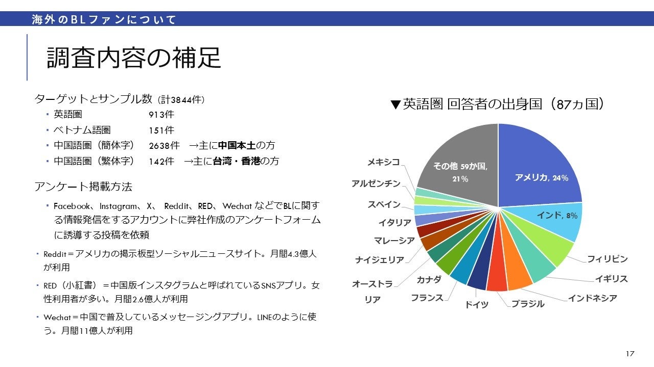 株式会社サンディアスでは、国内のBLファン約1000人、海外のBLファン約4000人にオンライン上でアンケートを実施しました。それぞれの層ごとに結果を集計して、傾向を分析しています。