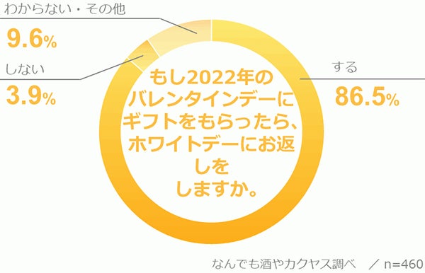 では、今年のバレンタインデーにギフトをもらったら、3月14日のホワイトデーにお返しをするかを聞いてみたところ、実に87%が「する」と回答。こちらもバレンタインデー同様、お菓子業界によるプロモーションがきっかけの日本独自の習慣ですが、「いただいたら、お返しする」という義理堅い日本人の特性もあるのか、広く浸透しているようです。