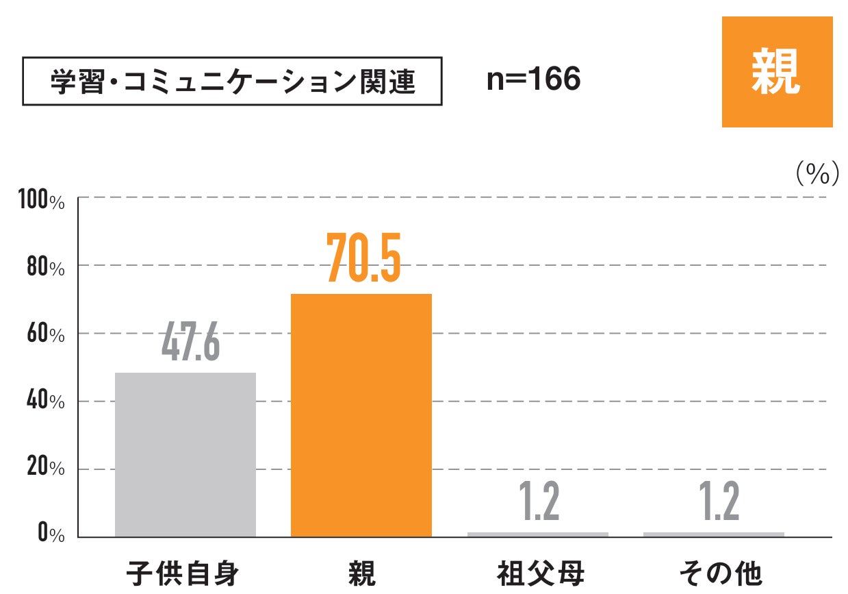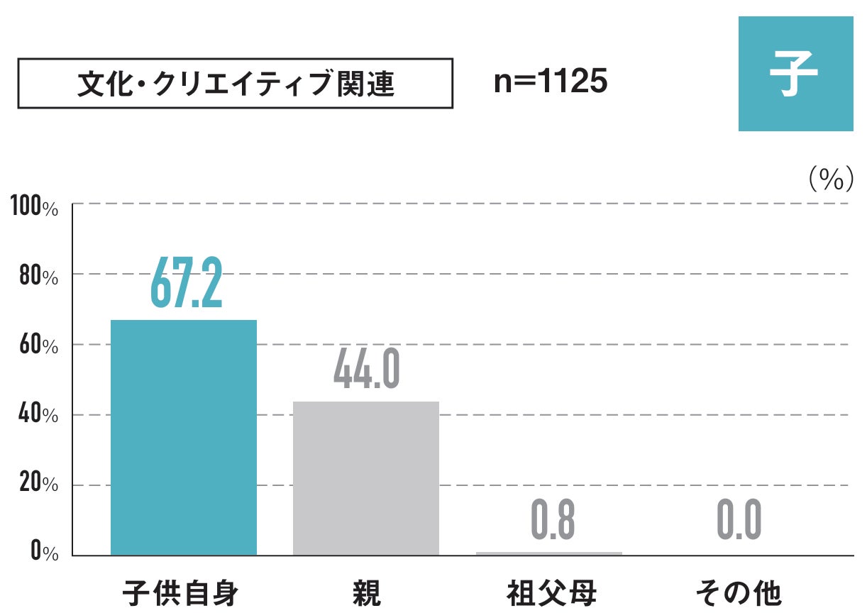 8割以上の親が何かしらの体験・経験をさせている(いた)と回答しました。さらには、運動・スポーツ関連や文化・クリエイト関連は子ども自身の意思で始めている場合が多いですが、学習・コミュニケーション関連になると親の意思で始めている割合が7割を超える結果になりました。ここからも、子育て中の親がコミュニケーションへの不安を感じているとともに、子どもの体験・経験につながるコンテンツを求めていることが考察できます。