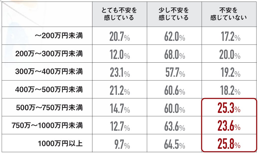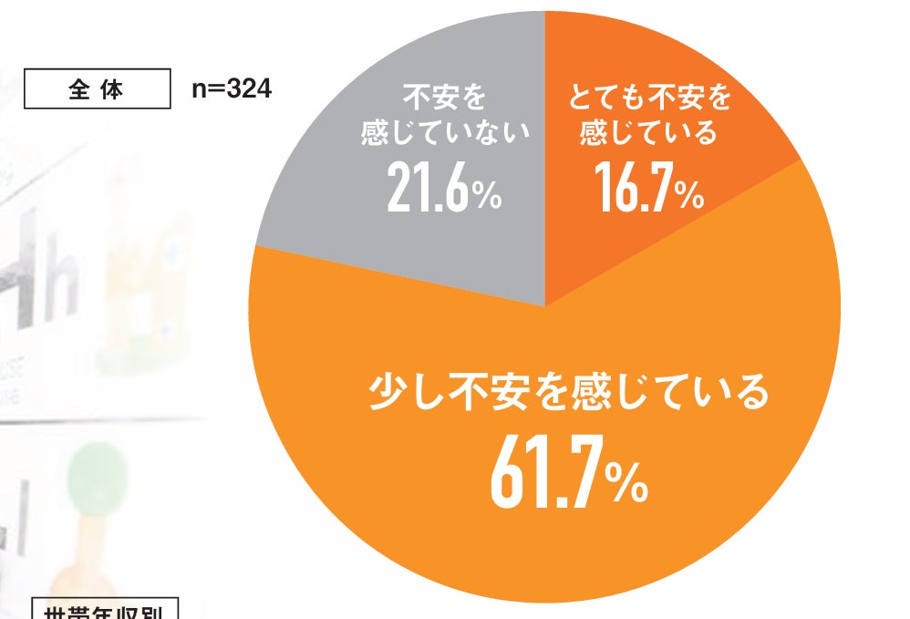 子育て中の親は、子どもの将来に対して不安を感じている方が約8割と高い結果に。ただし、世帯収入別になると経済的に余裕のある世帯ほど「将来の不安を感じていない」と回答する人の割合が増加しました。