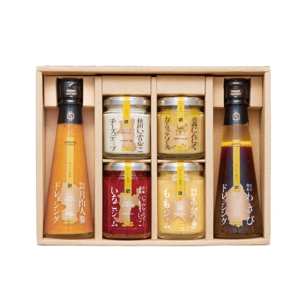 ギフト内容 ドレッシング(山形月山人参・岩手わさび)各160ml、青森ガーリックソース90g、秋田いぶりがっこチーズディップ85g、ジャム(福島もも130g、宮城いちご125g)