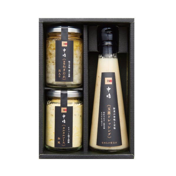 ギフト内容 匠中嶋タルタルソース(和風)110g、匠中嶋旨塩ねぎだれ100g、匠中嶋玉葱ドレッシング160ml