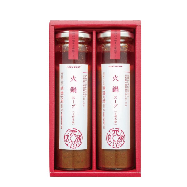 ギフト説明 「赤坂四川飯店」3代目オーナーシェフ陳建太郎氏監修。ご家庭で本格火鍋を味わえる鍋スープ2本詰合せです。