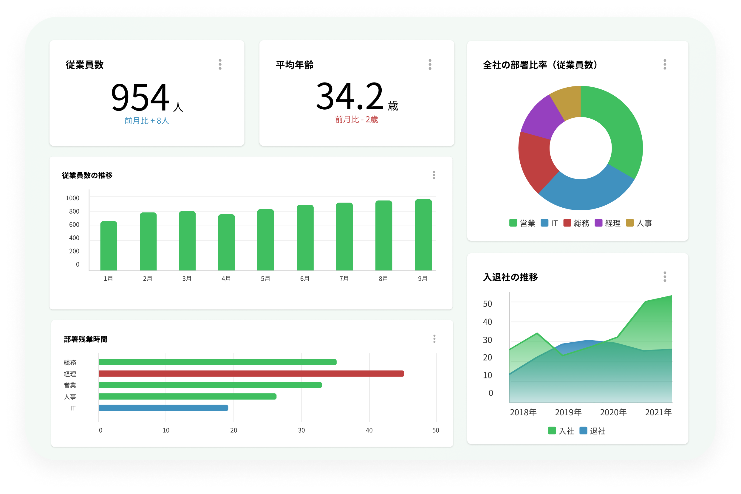 HRBrainに蓄積されていた組織情報を可視化し、従業員人数や男女比の組織情報、入退社推移や部署ごとの平均残業時間といった人事指標を直感的に把握することができます。