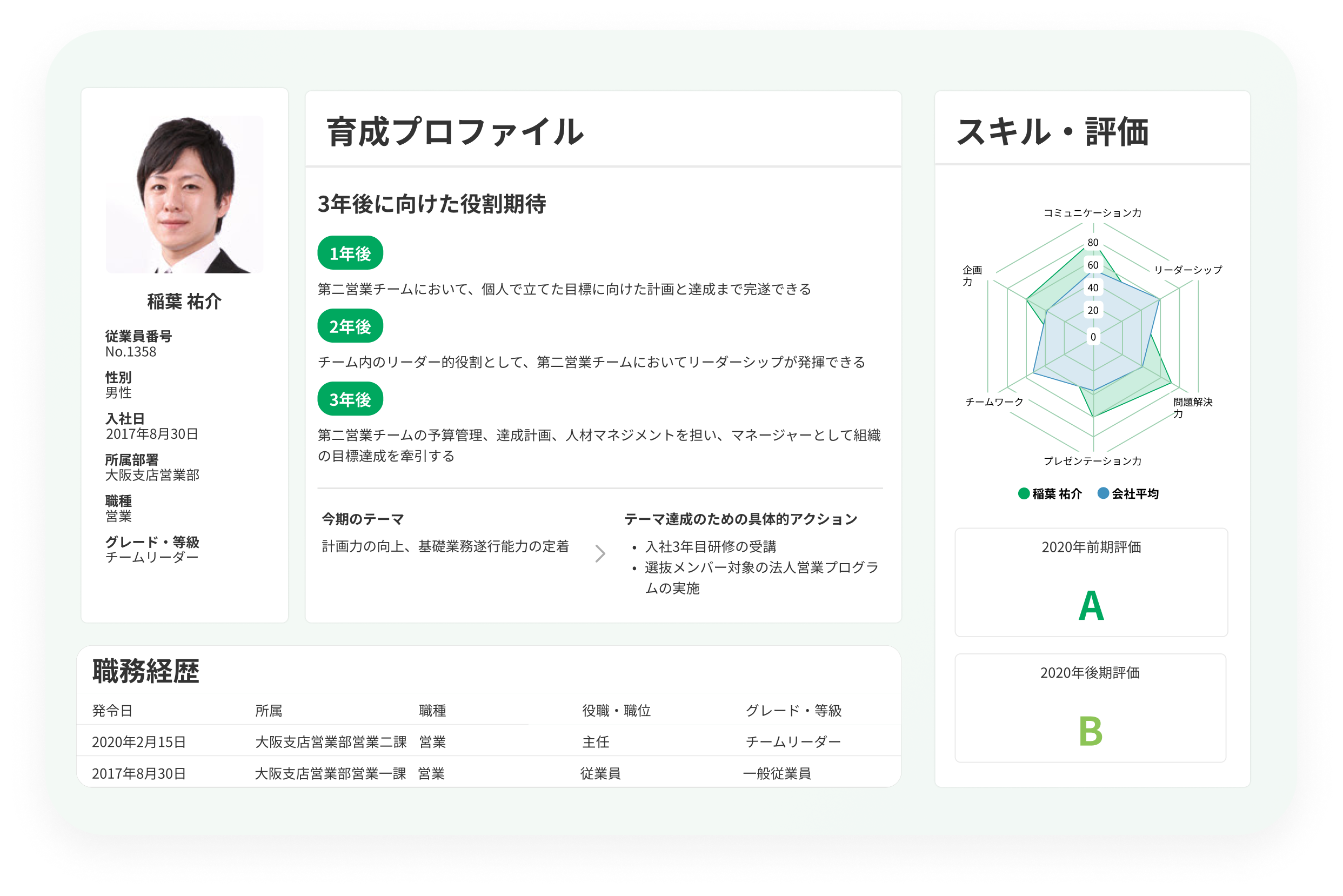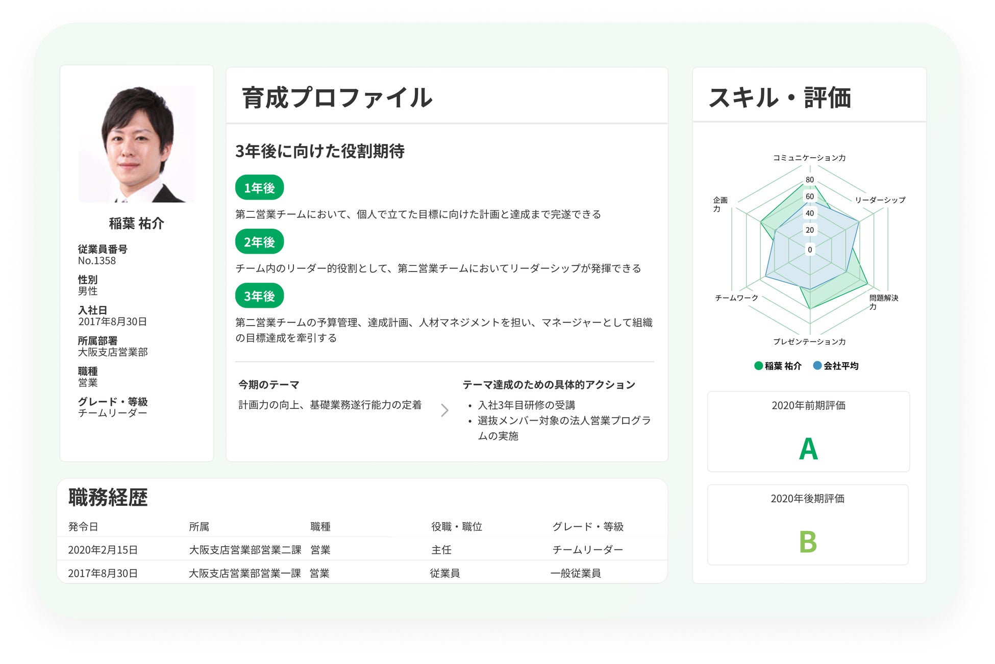 それぞれの従業員のキャリアプランや、活躍人材のスキル・パフォーマンスデータをひと目で把握でき、最適配置や人材抜擢などの意思決定にも活用ができます。
