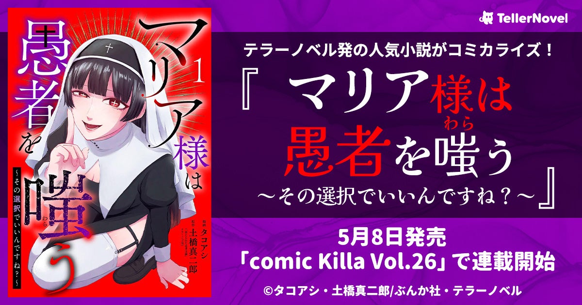 株式会社テラーノベル(本社:東京都港区、代表取締役社長:蜂谷宣人)はこの度、累計DL数760万(※)の小説共有プラットフォーム「テラーノベル( https://teller.jp/ )」発の人気小説『禁じられた思考実験』が『マリア様は愚者を嗤う~その選択でいいんですね?~』としてコミカライズされ、5月8日発売の「comic Killa Vol.26」(ぶんか社)にて連載を開始することをお知らせいたします。