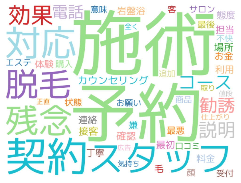医療業と同じく、美容に関するサービスを行うエステに関しての悪評も多くなっていました。施術中の会話の不快感や効果に対する不満、広告と実際の契約内容が違うといった不満が見受けられました。また、脱毛エステの予約を取れないことに対してのクレームも散見されました。