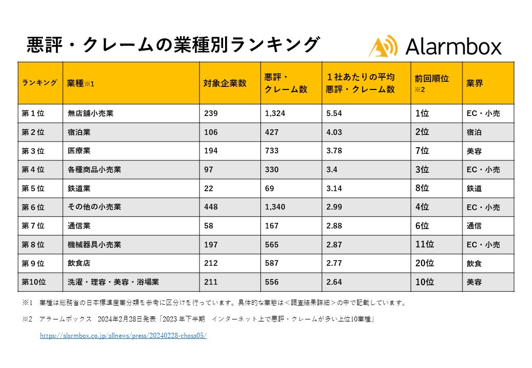 AI与信管理サービスを提供するアラームボックス株式会社(本社:東京都新宿区、代表取締役:武田浩和、以下「当社」)は、この度、10,750社を対象に、2024年上半期にSNS等インターネット上で投稿された各企業に関連する口コミや評判の中から悪評・クレームを抽出し「2024年上半期 インターネット上で悪評・クレームが多い上位10業種」を集計しましたので発表します。また、業界ごとの悪評・クレームの内容を解析し、頻出単語の集計をしましたので合わせて発表します。
