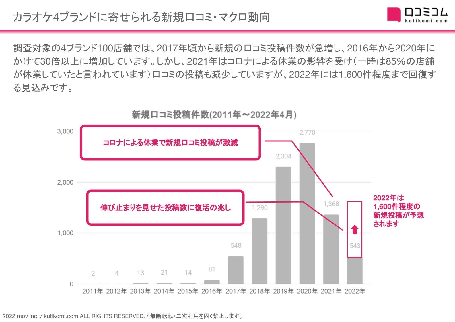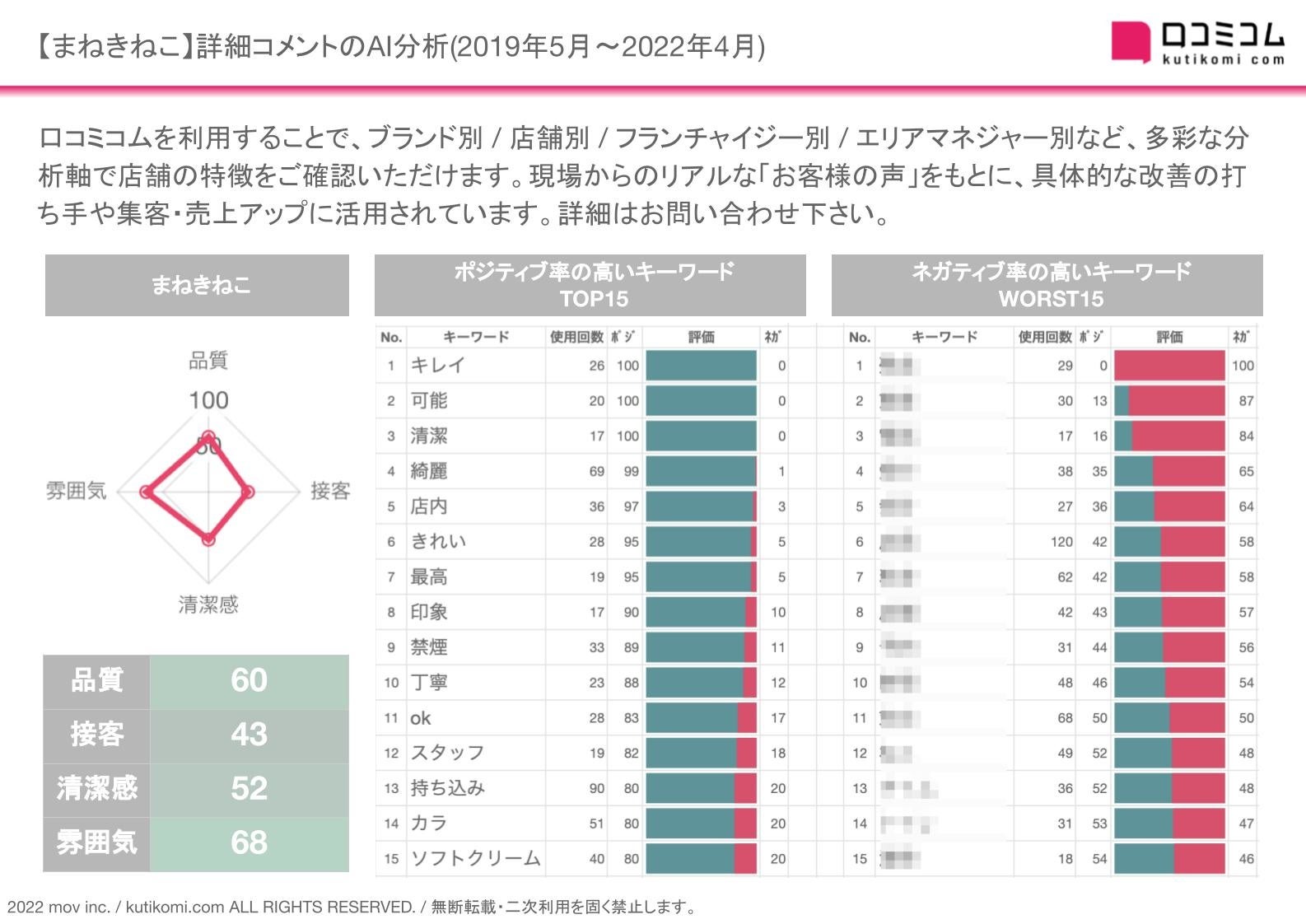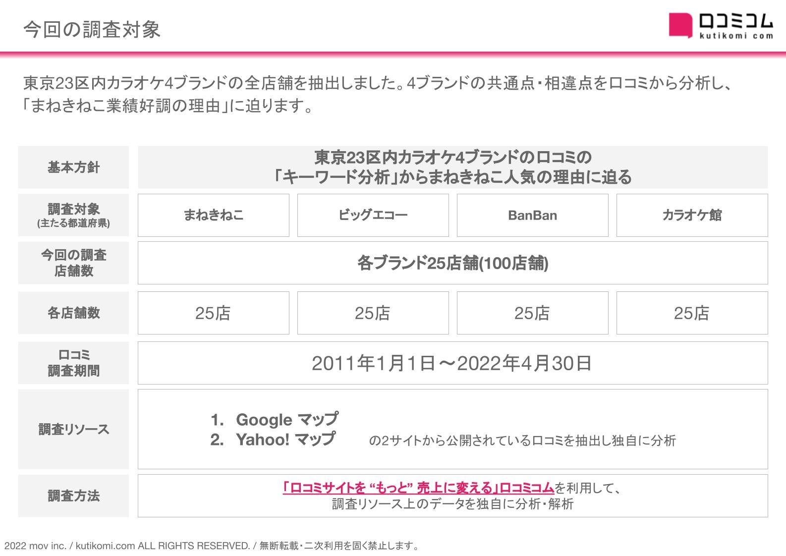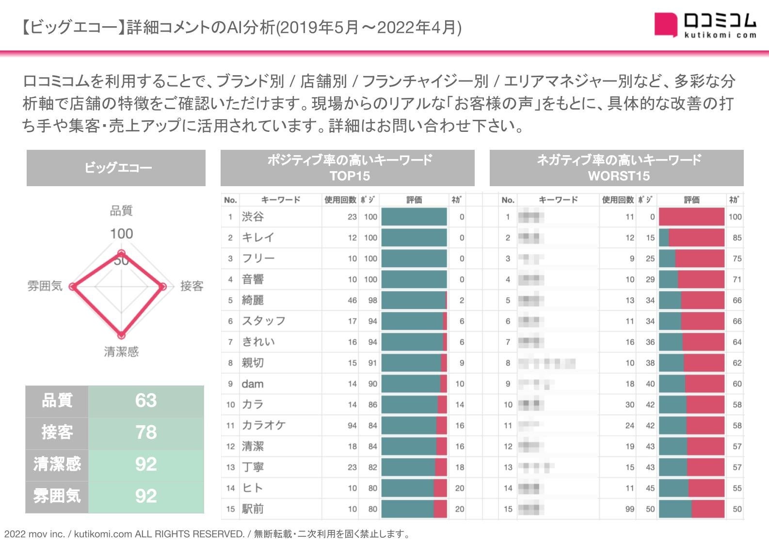 口コミサイトを”もっと”売上に変える『口コミコム』を運営する株式会社mov(代表取締役:渡邊 誠、本社:東京都渋谷区、以下mov)は、『口コミコム』独自のAI分析機能を用い、カラオケ大手4ブランド(まねきねこ、ビッグエコー、BanBan、カラオケ館)の合計100店舗に寄せられた9,000件の口コミを分析してレポートを作成しました。