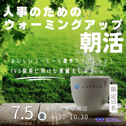 人事の方がリフレッシュしながら当日の採用イベントのためにウォーミングアップする朝活イベントです。健康的な散歩と美味しいコーヒーで一日のスタートを切り、時にはプレゼンテーション練習を行い、仕事の効率とコミュニケーション能力を向上させます。