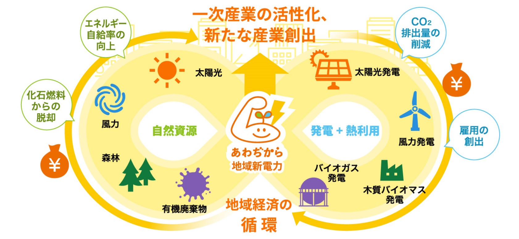 あわぢからは、「淡路から、未来のチカラ、あわぢから」というスローガンを掲げ、現在では単に電力を売買する地域新電力事業に留まらず、再生可能エネルギーの創出も行う地域エネルギー会社へと領域を広げました。