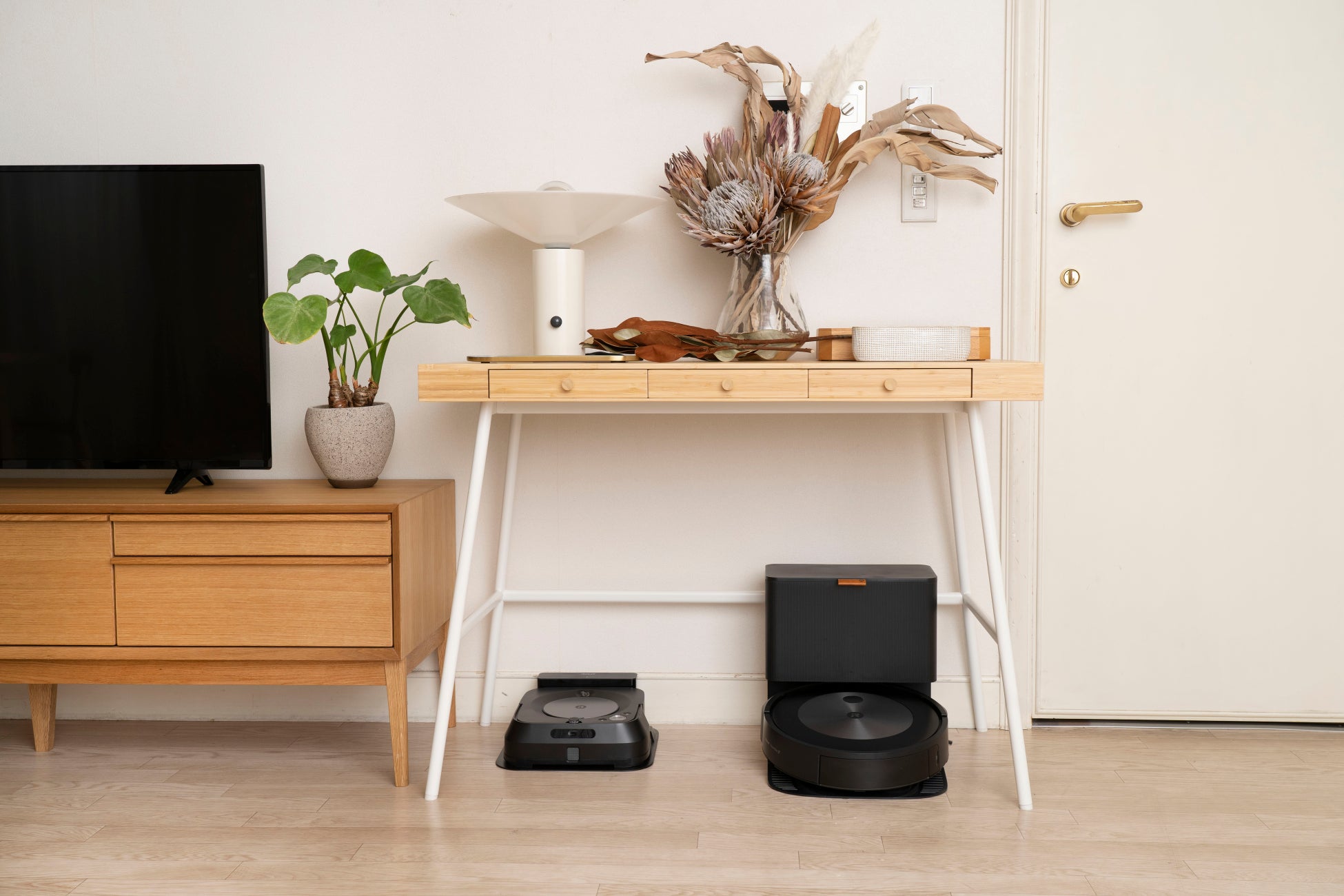 また「ルンバ j7+」「ルンバ j7」は、家に溶け込むデザインをコンセプトとしています。「ルンバ j7+」では、従来縦長であったクリーンベース®(自動ゴミ収集機)が横長タイプに再設計され、テーブル等の下に収まることで占有スペースの減少に一役買っています。また、「ルンバ j7」と同様にグラファイトカラーのメタル調のディスクアイコンを採用した「ブラーバ ジェット m6」を3月4日(金)から販売開始。統一感のある色合いで、洗練された印象を与えるルンバとブラーバが、生活空間の美しさを引き立てます。