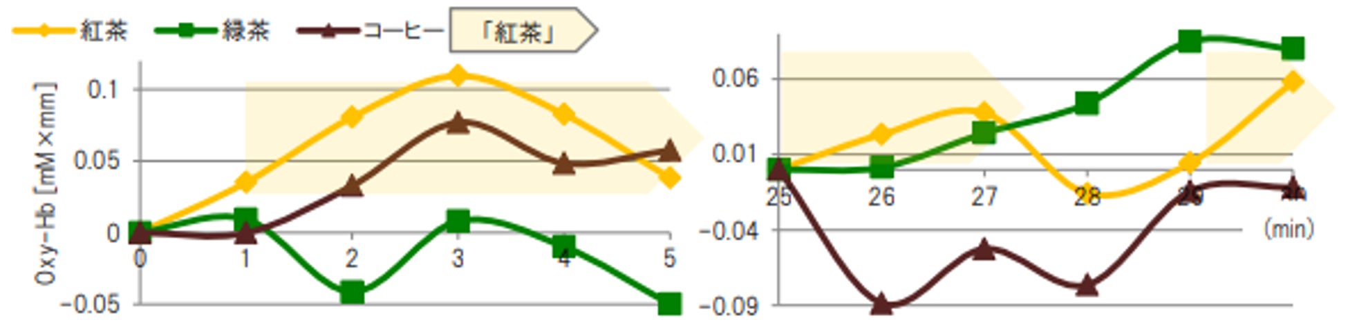 その結果、「紅茶」「緑茶」「コーヒー」3種の飲料のうち、会話開始からの30分間で脳の働きが最も活発で安定的だったのは「紅茶」で、前頭葉を活性化し、論理的思考力、表現力、創造・想像力を高めて、相手との会話を弾ませるのに効果的な飲料であることが判りました。また、コミュニケーションの観点では、リラックスした心理状態へと促す兆候が見られた「紅茶」が、相手との会話を楽しむための良きコミュニケーションツールになっていることも示唆されました。