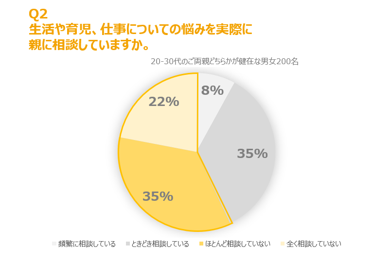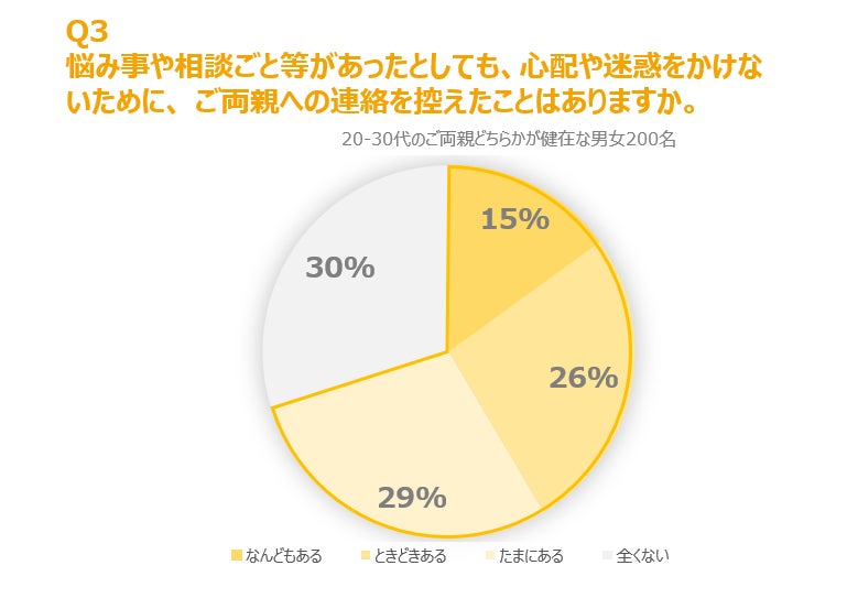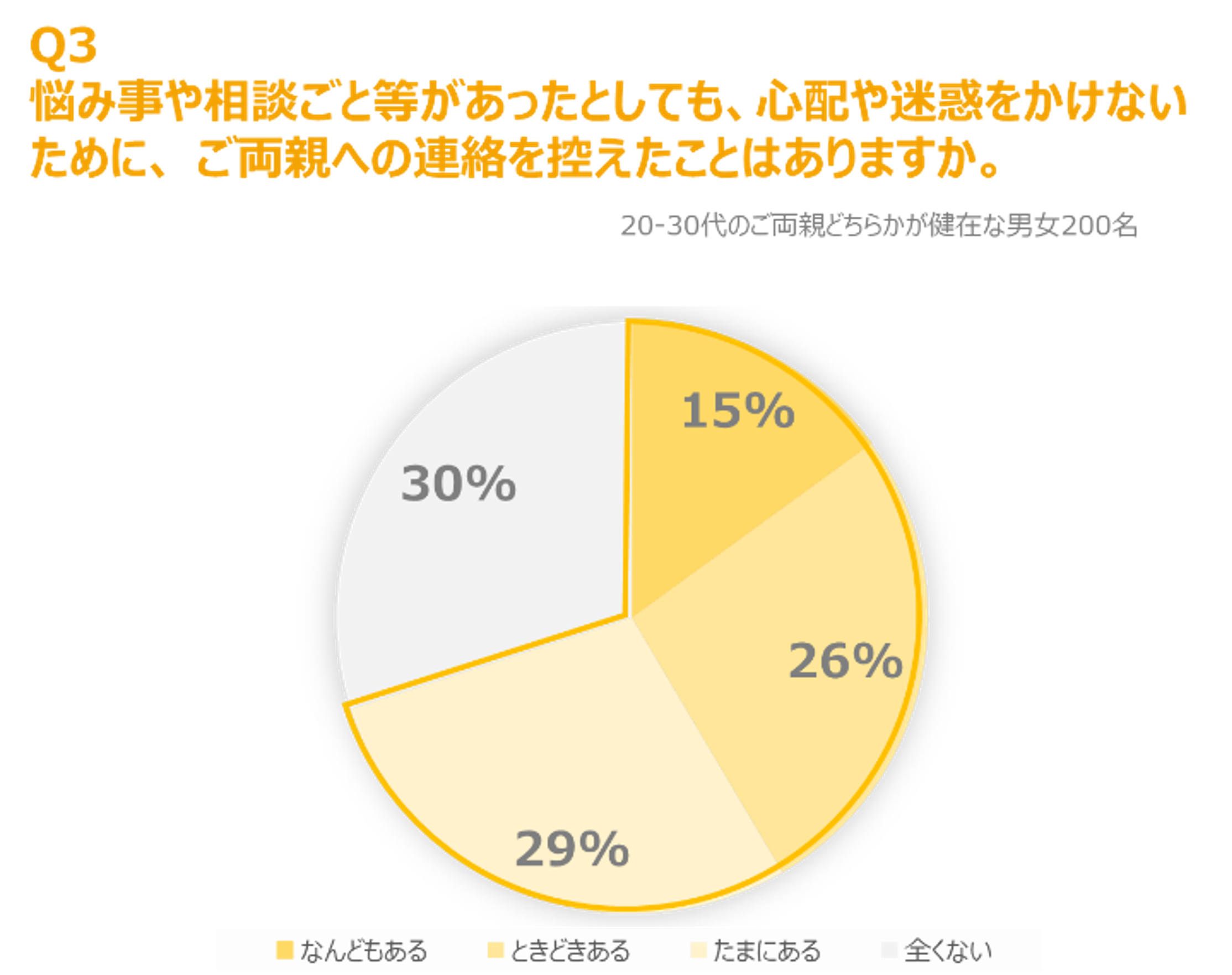 | 【調査結果サマリー】 ① 普段“親”に連絡をする内容を尋ねると、悩みや相談事で連絡する人は“おとな”の中でたったの20%。 ② 生活や仕事、育児に関して悩みがあっても過半数以上が実際には“親”に相談できていないという結果に。 ③ 心配をかけないために、あえて連絡をしなかったことがある“おとな”は70%にものぼることが明らかに。 ④ それらの悩みをあまり相談されていないという“親”の約70%が「定期的に連絡をして聞いている」 「何かのタイミングで連絡したときに聞くようにしている」と答え、“親”としてはいつまでも“こども”のことを気にかけていることが伺える結果に。 |