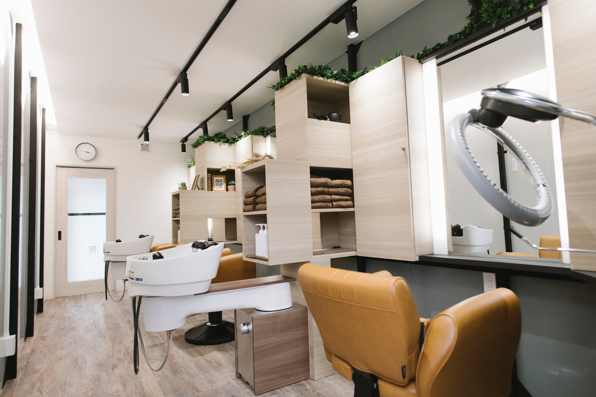 本店舗は環状八号線沿いにあり、デザイン性が高い外観となっているため視認性がよく、サロンのご利用者様や施術を受けるお客様に認知していただきやすいサロンとなっています。ヘアスペースは3席を設け、利用者様が複数のお客様を同時に施術することも可能です。(施術する席数の事前予約が必要)