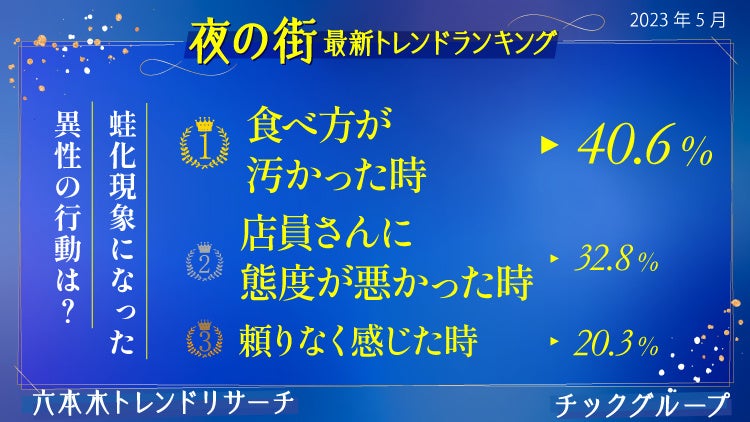 最近、SNSでも話題に多く上がっている“蛙化現象”。最近では、「好きな男性や憧れの人の“ちょっと気になる行動”を目撃した瞬間に、気持ちが冷める現象」として使われているようです。今回回答した六本木キャストの60.9%が「蛙化現象の経験がある」と回答しており、「食べ方が汚かった時」が圧倒的な理由、続いて「店員さんに態度が悪かった時」と食事の際のマナーが悪いと不快に感じてしまう女性が多いようです。世界最大の大人の街六本木で常に接客をする彼女たちだからこそ、“食事のマナー”は重要なポイントなのではないでしょうか。
