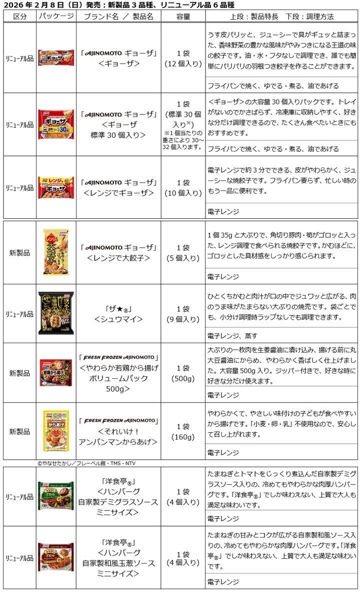 味の素冷凍食品株式会社(社長:寺本博之 本社:東京都中央区)は、家庭用冷凍食品の新製品5品種、リニューアル品6品種を2026年2月8日(日)および2026年3月8日(日)より全国で発売します※1。