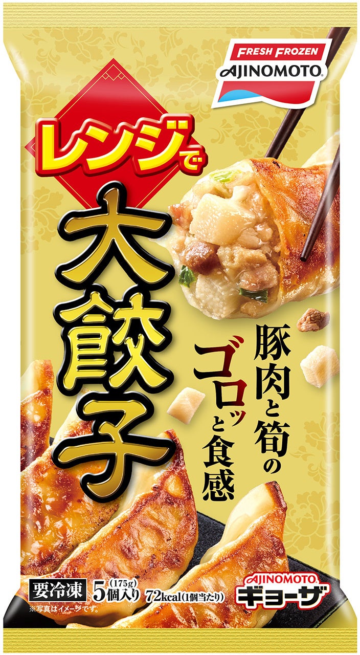 <レンジでギョーザ>は、電子レンジで簡単に調理ができる特長をより伝わりやすくするため、パッケージをリニューアルしました。また、新製品<レンジで大餃子>は、1個35gの大ぶりサイズで、角切り豚肉のジューシーさと筍のシャキッとした食感を組み合わせた、食べ応えのある一品です。1袋に5個入りで、主菜としても十分な満足感が得られます。独自技術により加熱後も皮がやわらかく、ジューシーな仕上がりを実現しました。