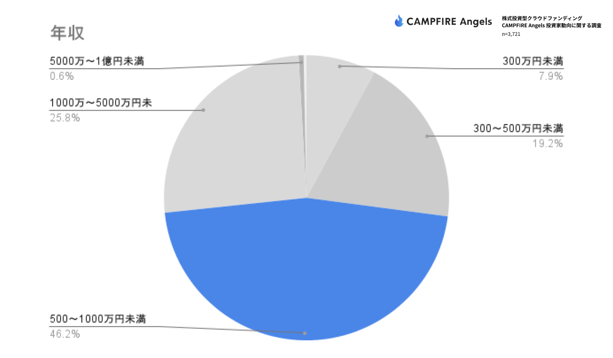 登録投資家の職業・年齢の平均年収と考えられる「500-1,000万円」、資産もそれに準ずる「300-1,000万円」が最も多い回答となりました。「1000万円~1億円」もほぼ同じ割合の回答数となり、資産の多い投資家の方にも株式投資型クラウドファンディングが広がっていると考えられます。