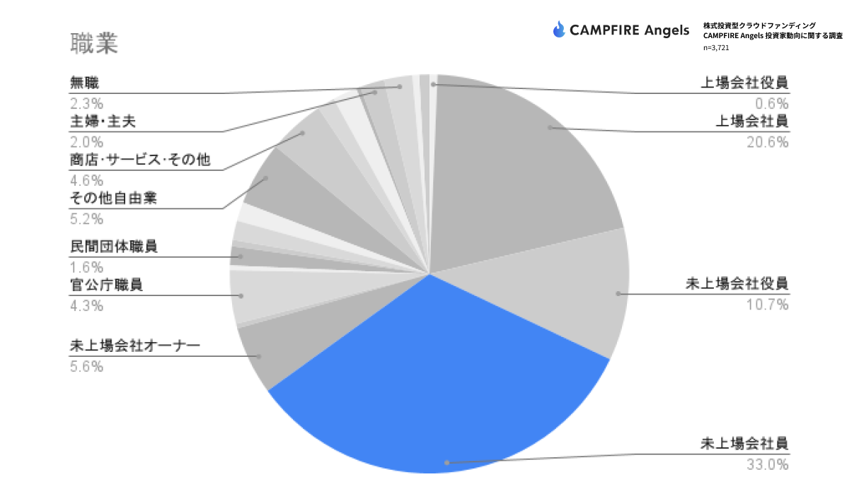 経営との距離感が比較的近く、スタートアップビジネスへの興味関心・理解度が高いと推測される、未上場会社に勤務する会社員・役員・オーナーの方の登録が目立ち、合計で約50%を占める結果となりました。