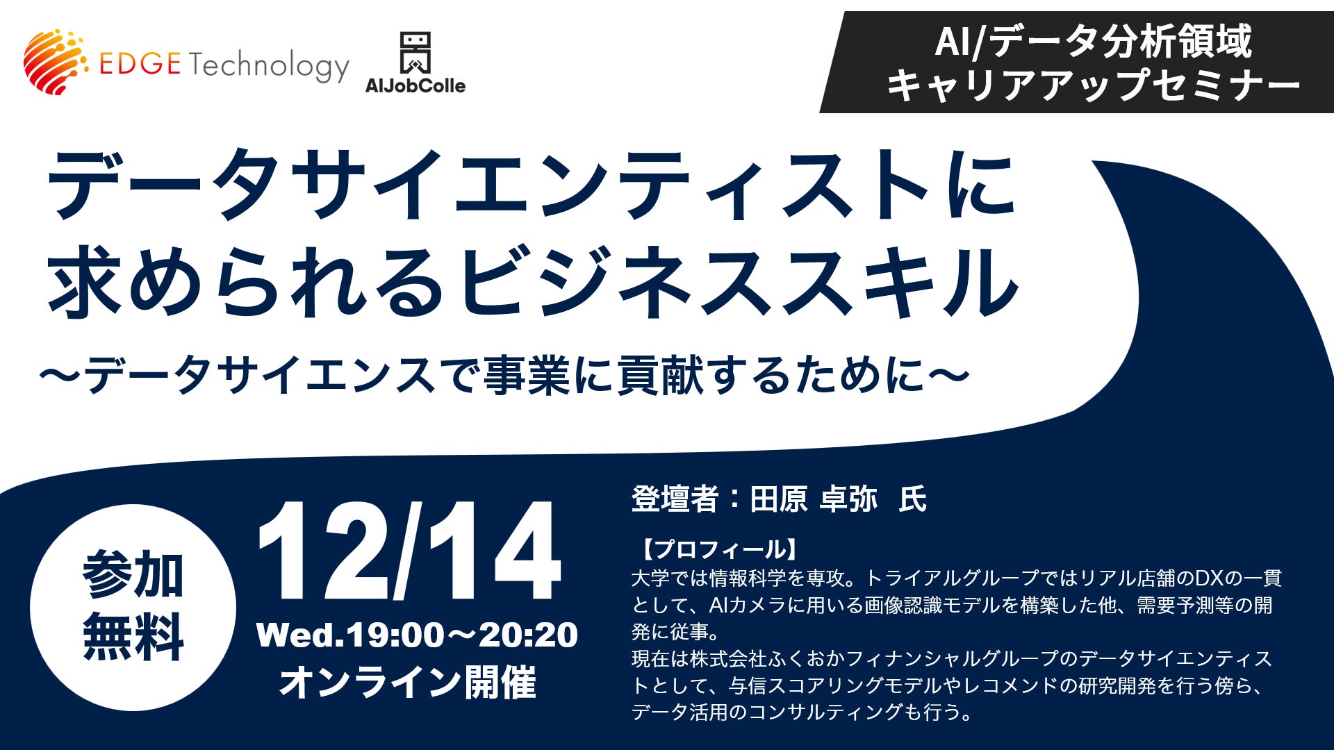 データ分析をビジネスへ繋げたい方へ!エッジテクノロジー(AIジョブカレ)が「データサイエンティストに求められるビジネススキル」セミナーを【2022年12月14日(水)19:00】無料開催!