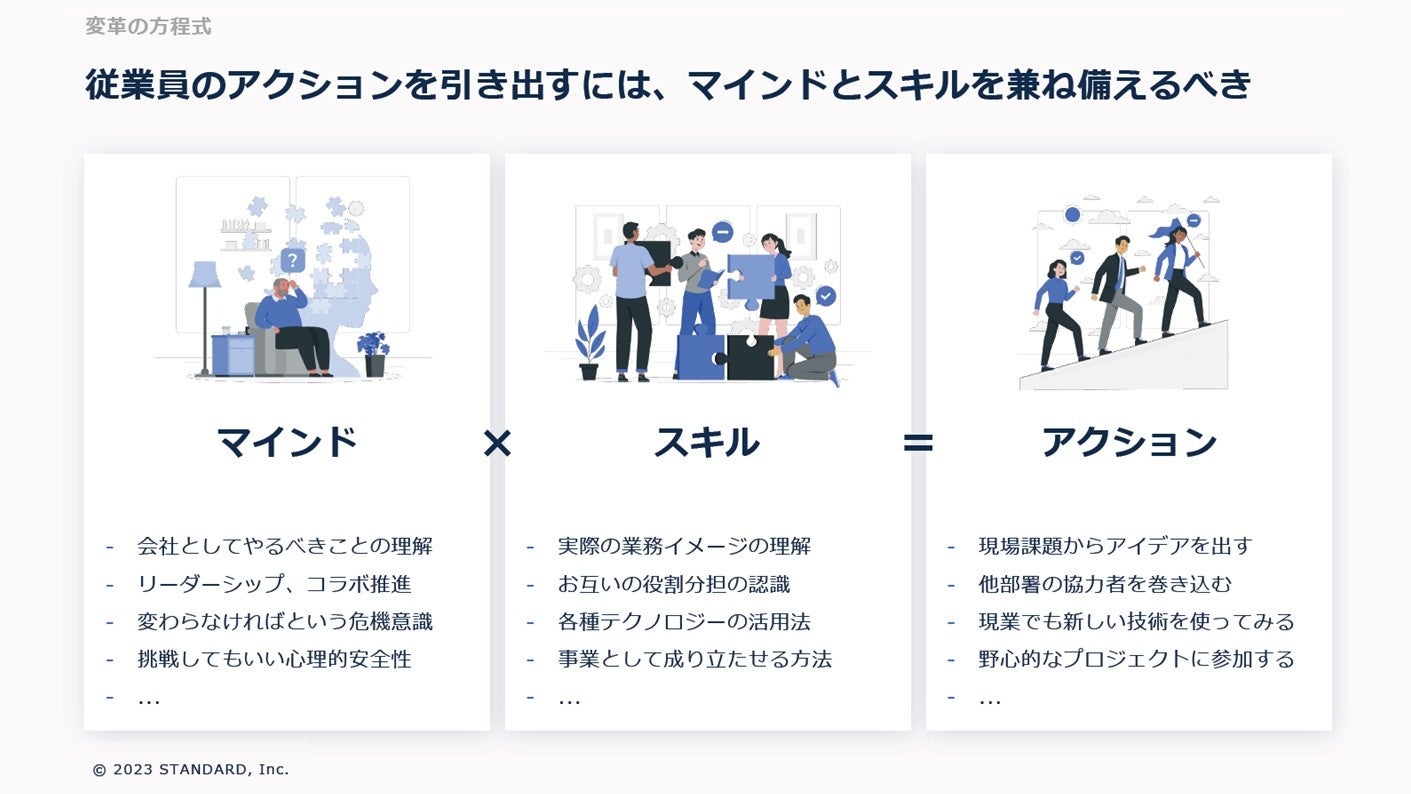 これは、当社が700社以上のDX推進の支援をしてきた中で、知識習得のみの研修の採用し従業員のマインドや適性への考慮を置き去りにしてしまったことで、従業員による実際の行動に繋がらない、DXプロジェクトが立ち上がらない、推進が難航してしまうケースを数多く目の当たりにしてきたが故の結論になります。