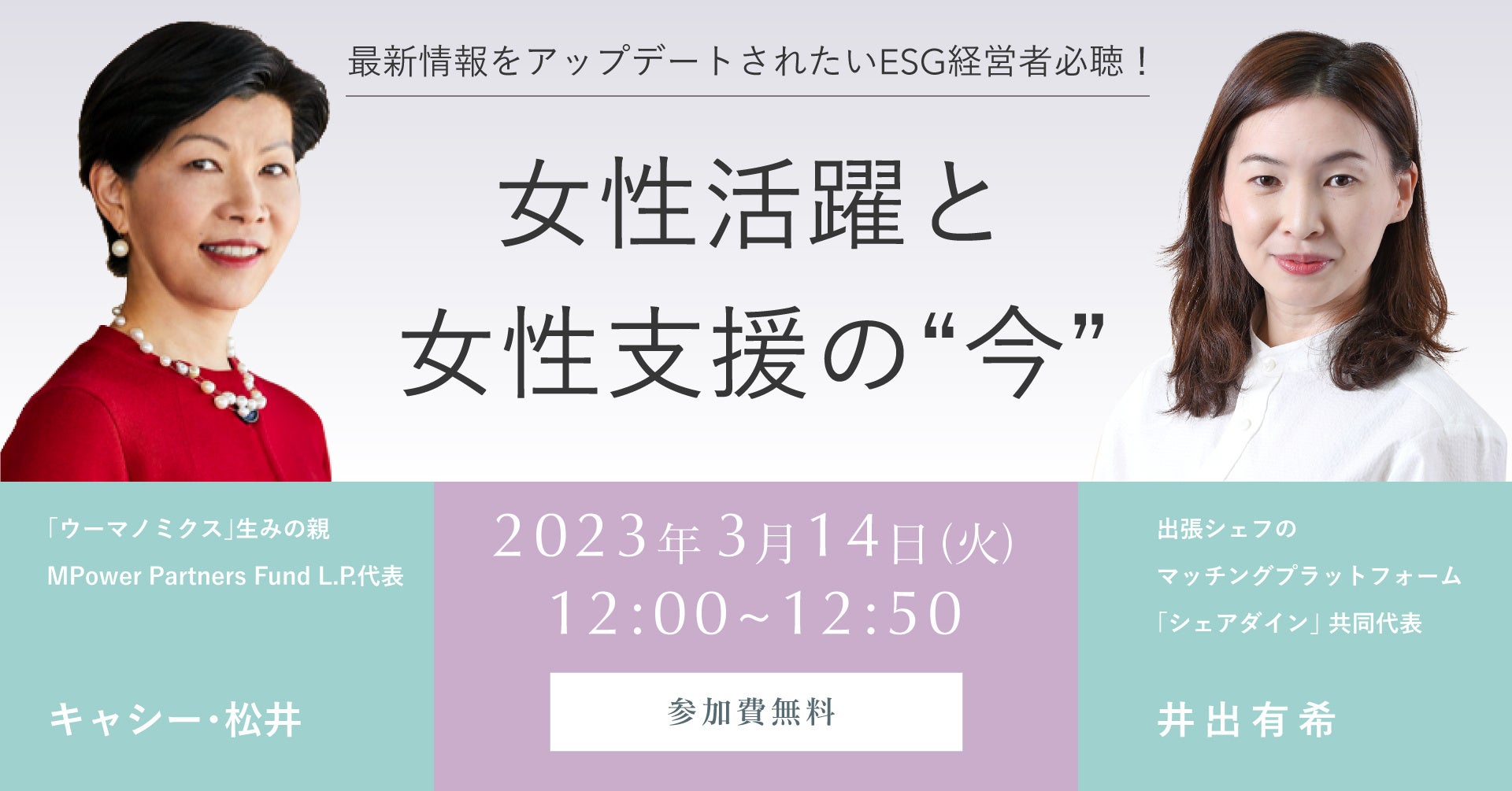 出張シェフサービス「シェアダイン」を運営する株式会社シェアダイン(本社:東京都港区、以下シェアダイン)共同代表の井出有希と、ESGに取り組むMPowerPartners Fund L.P.代表のキャシー・松井氏が「女性活躍と女性支援の”今”〜この2年で変わったこと、進んでいないこと〜」について対談します。2021年は両者が「女性社員の育て方」について対談し、ダイバーシティ経営担当や女性管理職を目指す方など幅広い方から大きな反響を呼びました。今回2年ぶりの対談となります。
