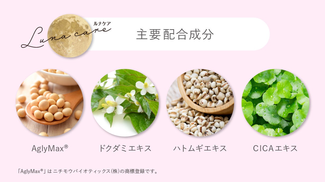「 ルナケア」は、プレ7日間の女性の美習慣をサポートする4つの和漢植物成分を配合しています。麴菌で発酵させた特別な大豆イソフラボン「AglyMax®︎(麹菌発酵大豆イソフラボン)」、古くから和漢植物として親しまれてきた「ドクダミエキス」や「ハトムギエキス」のほか、韓国では昔から和漢植物として使用され近年では「CICAエキス」の名で韓国コスメにも多く利用されている「ツボクサ抽出物」を配合。お召し上がり方は、1日1粒を水やぬるま湯で飲んでいただくだけなので、手軽に続けやすくなっています。