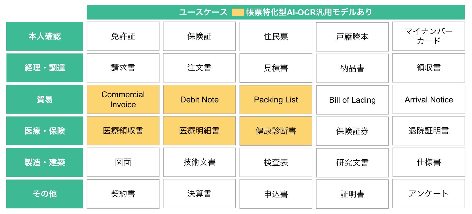 非定型帳票には様々な種類の帳票読み取りニーズがありますが、「Flax Scanner HUB」は帳票の種類を問わず情報抽出が可能です。また、シナモンAIには、すでに学習した帳票特化型(特徴量学習型)AI-OCRモデルがあり、それらを活用することで、より高精度な情報抽出が可能になります。