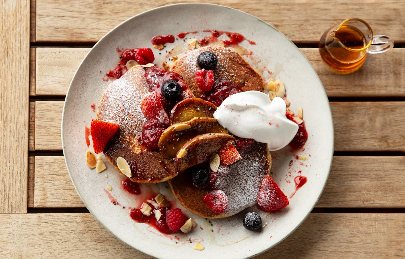 バーミキュラの特製パンケーキグリドル(鉄板)で焼いた全粒粉のパンケーキは、しっとり&ふわふわ。生地にはバターを使用せず、ホイップクリームは豆乳とココナッツを使用するなど、おいしさと健康が両立する、体に優しいパンケーキです。