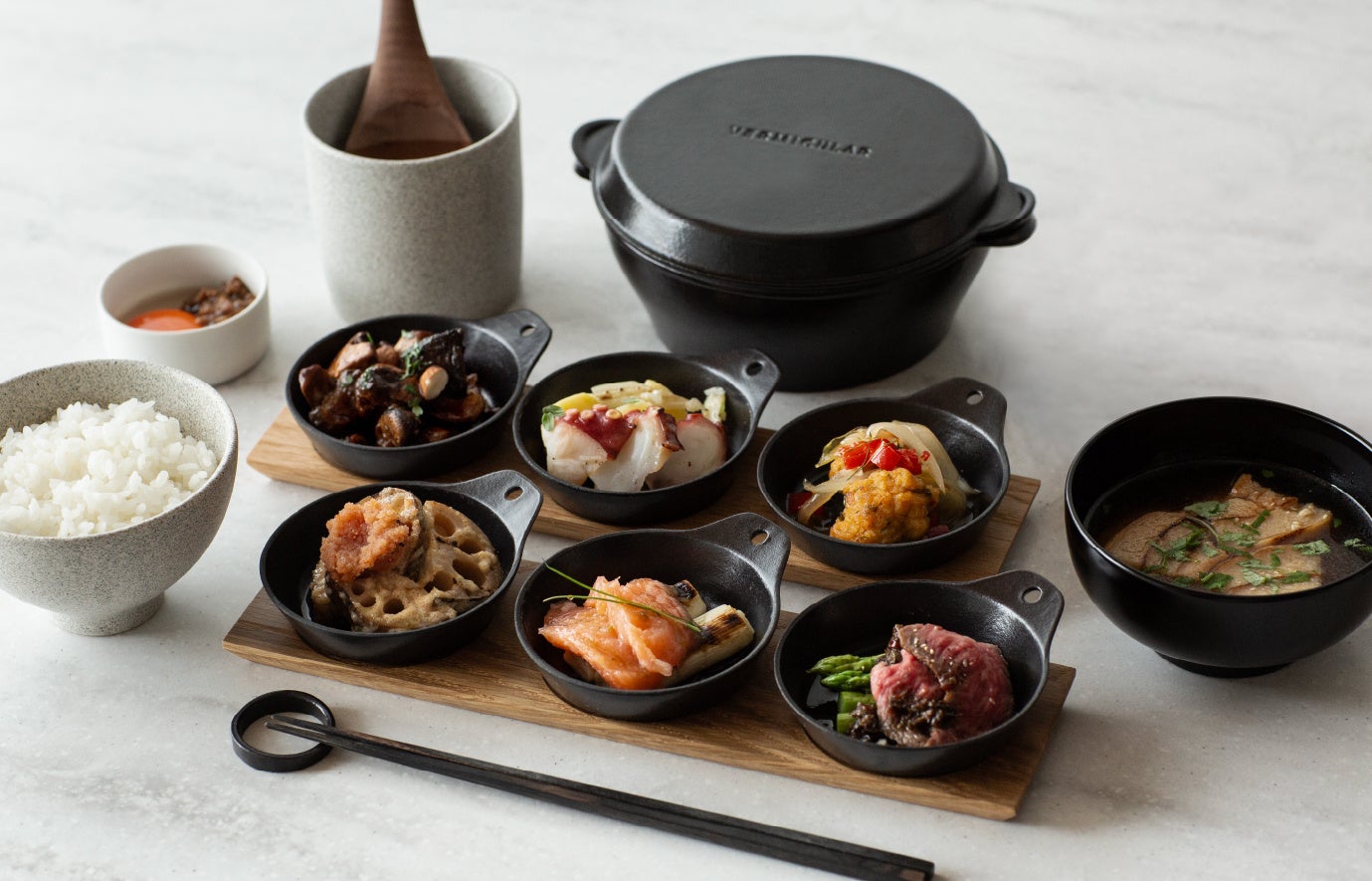 バーミキュラ ライスポットで炊いたご飯と、ご飯を最高においしく食べられるおかずを7種ご用意。ライスポットで低温調理し、しっとりジューシーなローストビーフやサーモンのミキュイ、オープン当初から大人気の自家製醤油麹で食べる卵かけご飯もお楽しみいただけます。