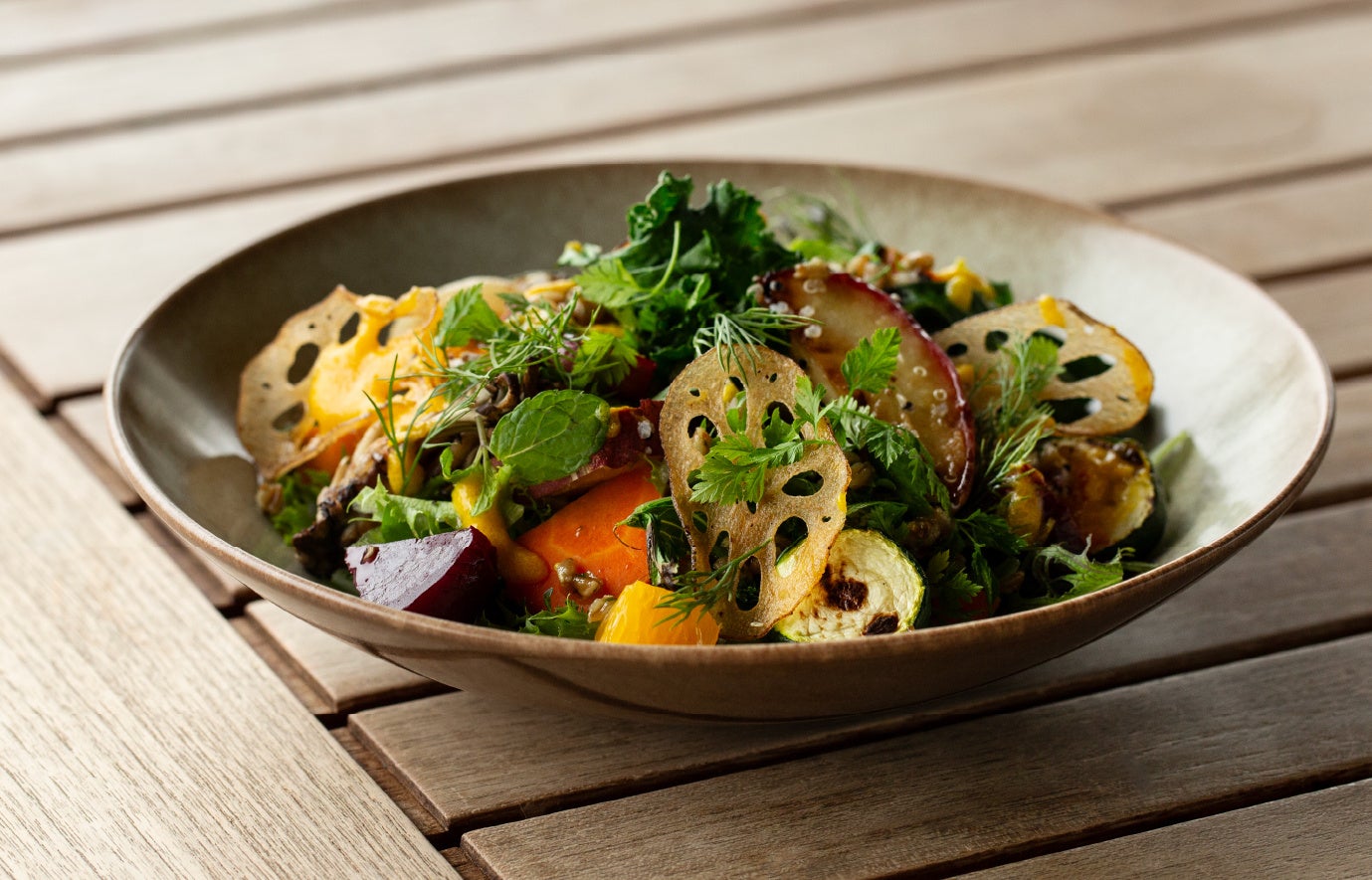 レタス、にんじん、かぼちゃなどの野菜、フルーツ、ハーブ、ナッツ、穀物が入った、ボリューム満点な心と体が喜ぶサラダです。