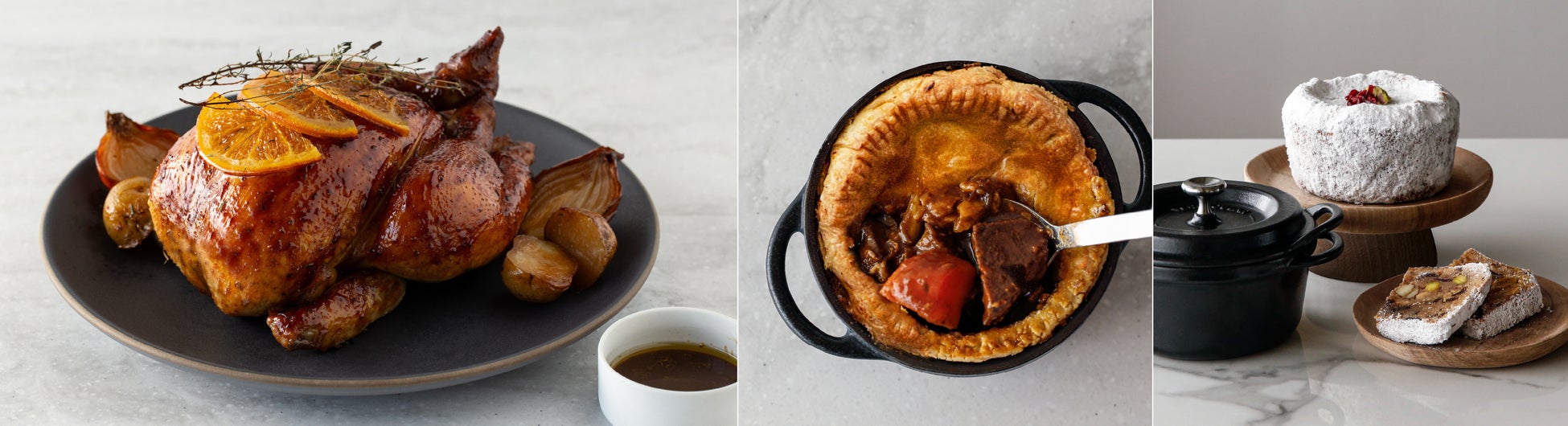 ポットメイドベーカリーに、クリスマスの特別メニューが登場!鹿児島産ハーブ鶏を使用した、「鹿児島ハーブ鶏のクリスマスローストチキン」は、オレンジで作った特製ソースを塗りながら低温でじっくり火入れすることで、驚くほど柔らかくジューシーに。丸鶏といっしょに無水調理し、素材本来の甘みが引き出されたじゃがいもや玉ねぎといっしょに、クリスマスのメイン料理としてお召し上がりください。さらに、バーミキュラでとろとろに煮込んだ牛ほほ肉のビーフシチューを、サクサクのパイ生地で包み込んだ「ビーフシチューのポットパイ」、ドライフルーツやナッツをふんだんに使用し、10cmのバーミキュラで外はサクッと中はしっとりとした食感に焼き上げた「バーミキュラ シュトレン」もご提供いたします。ぜひ、バーミキュラならではのクリスマス特別メニューをお楽しみください。
