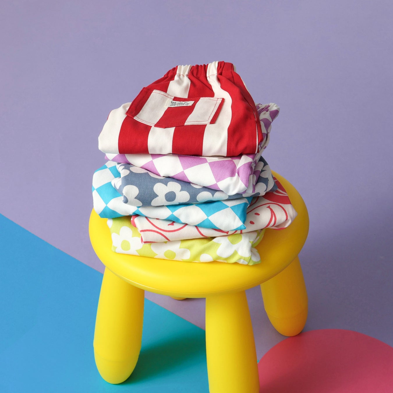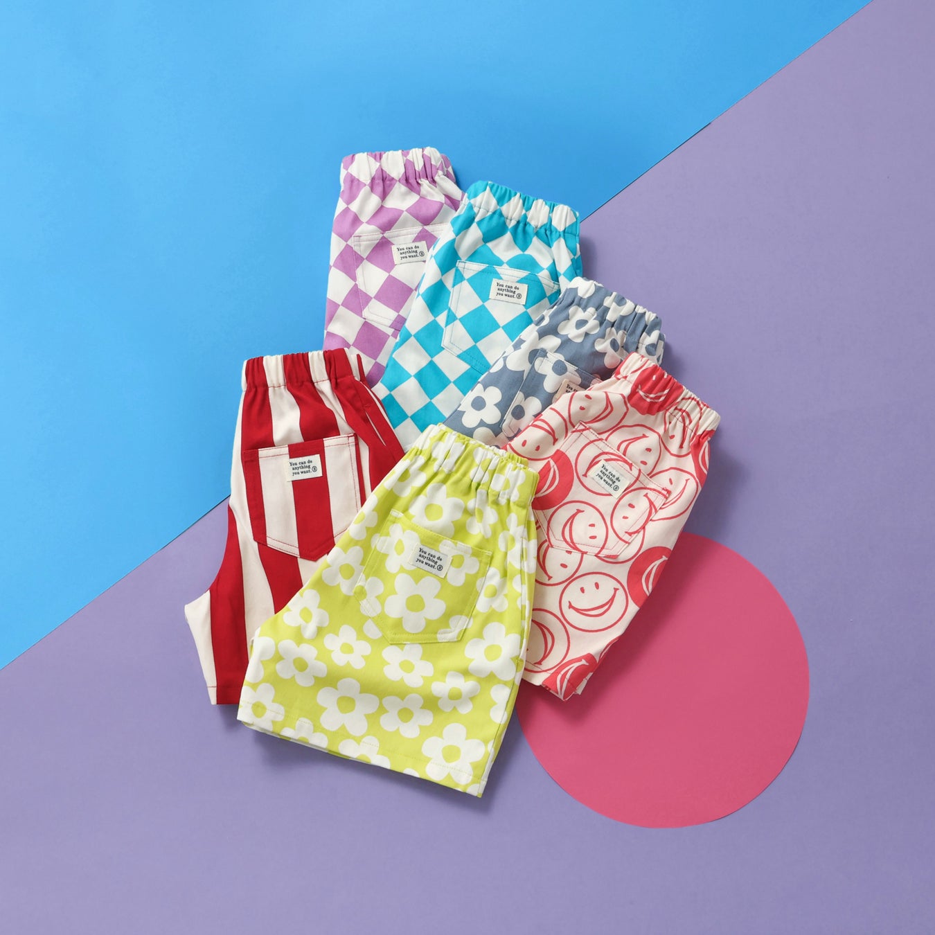 スマイルの総柄・お花・ダイヤのチェッカーデザインで、柄カラーともにポップでかわいいアイテム!