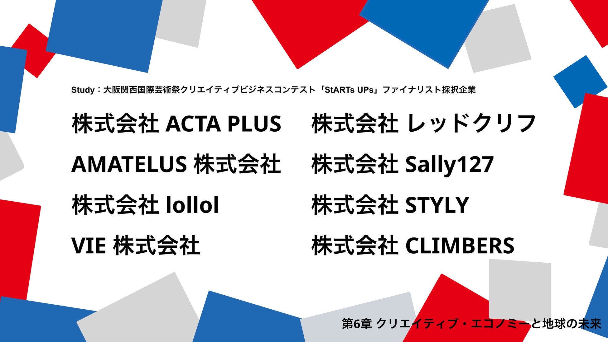 Study:大阪関西国際芸術祭実行委員会(株式会社アートローグ内 本社:大阪府大阪市、理事長:鈴木大輔)が2025年7月23日(水)に開催する【クリエイティブ・エコノミー特化型ビジネスコンテスト「StARTs UPs(スターツアップス)」】出場ファイナリストが決定したのでお知らせします。