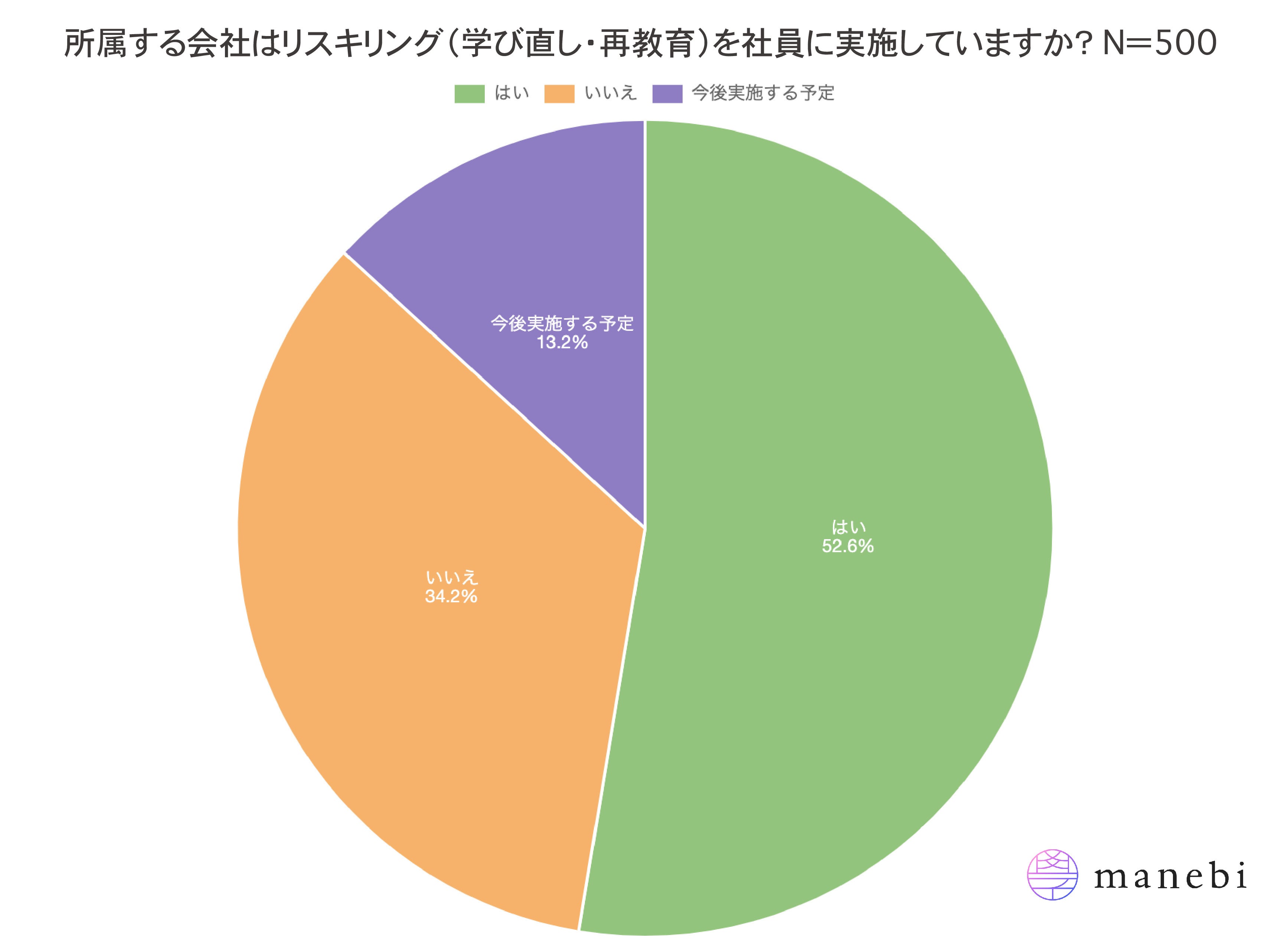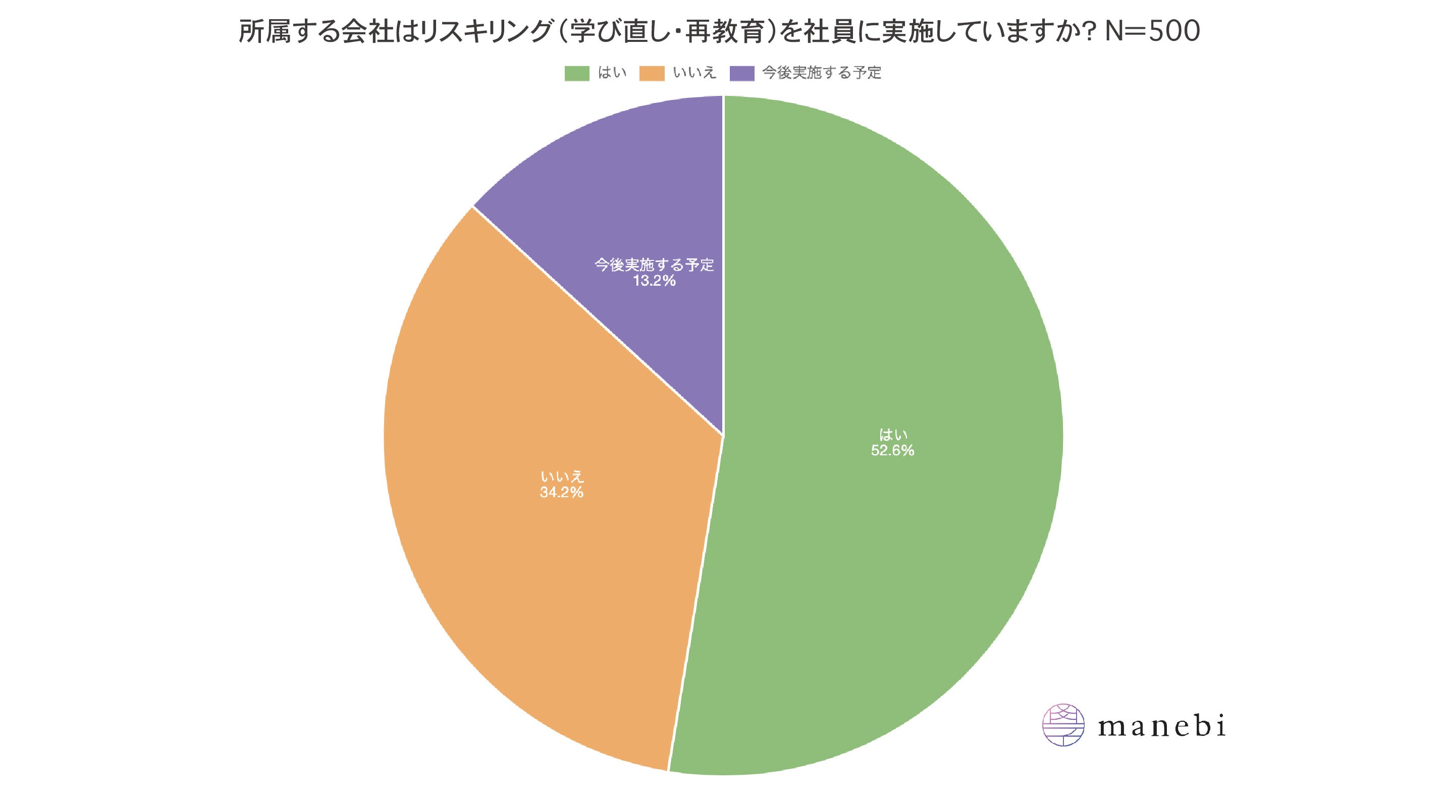 株式会社manebi(東京都千代田区 代表取締役執行役員CEO:田島 智也 以下、manebi)は、国内企業500社に対して「リスキリング」の実施状況に関するアンケートを実施しました。5割以上の国内企業においてリスキリング(学び直し)が行われているなどの調査結果を以下に発表いたします。