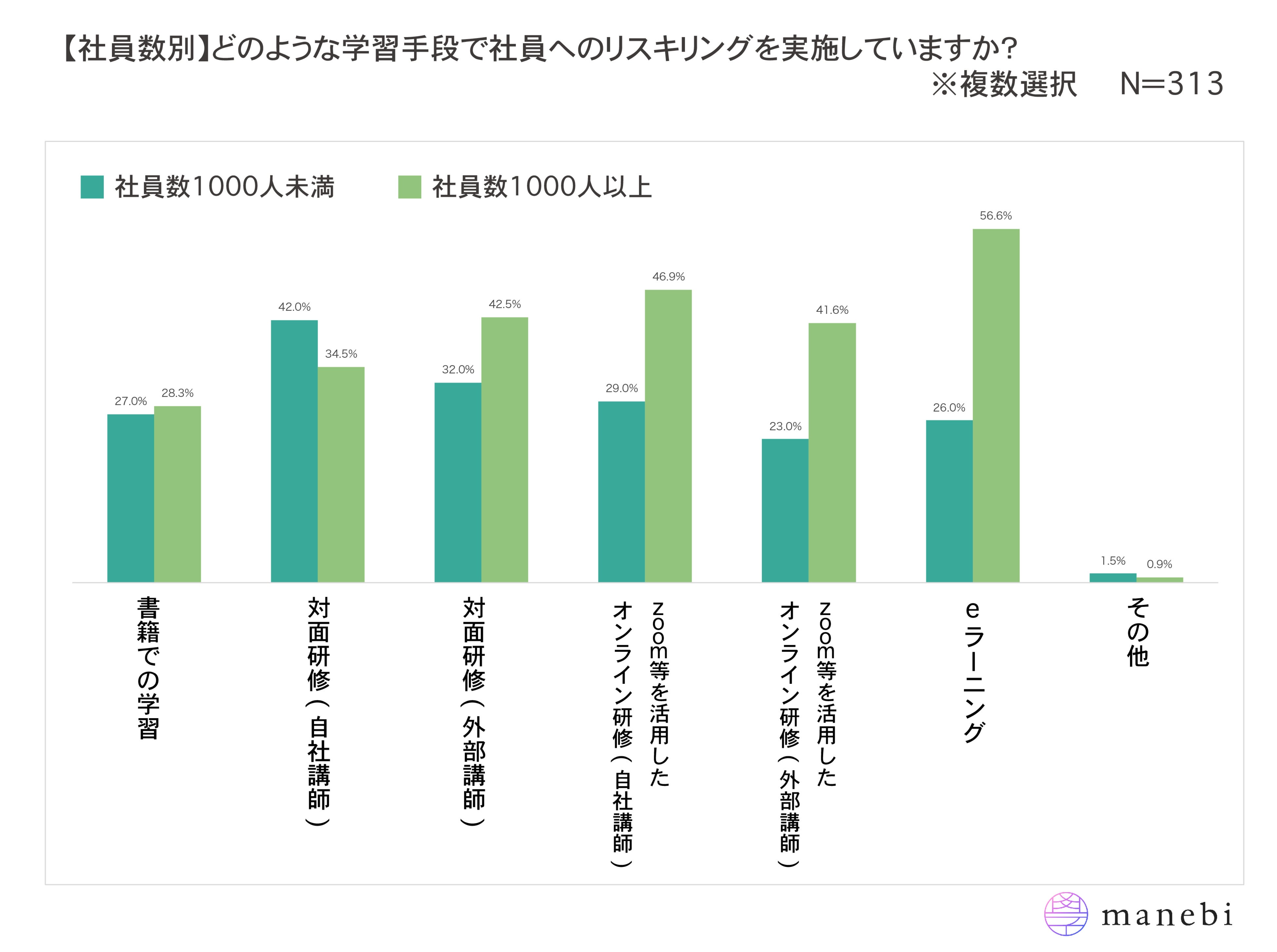 - リスキリングの学習⼿段は、社員数1000名以上の⼤企業では、オンラインが主流